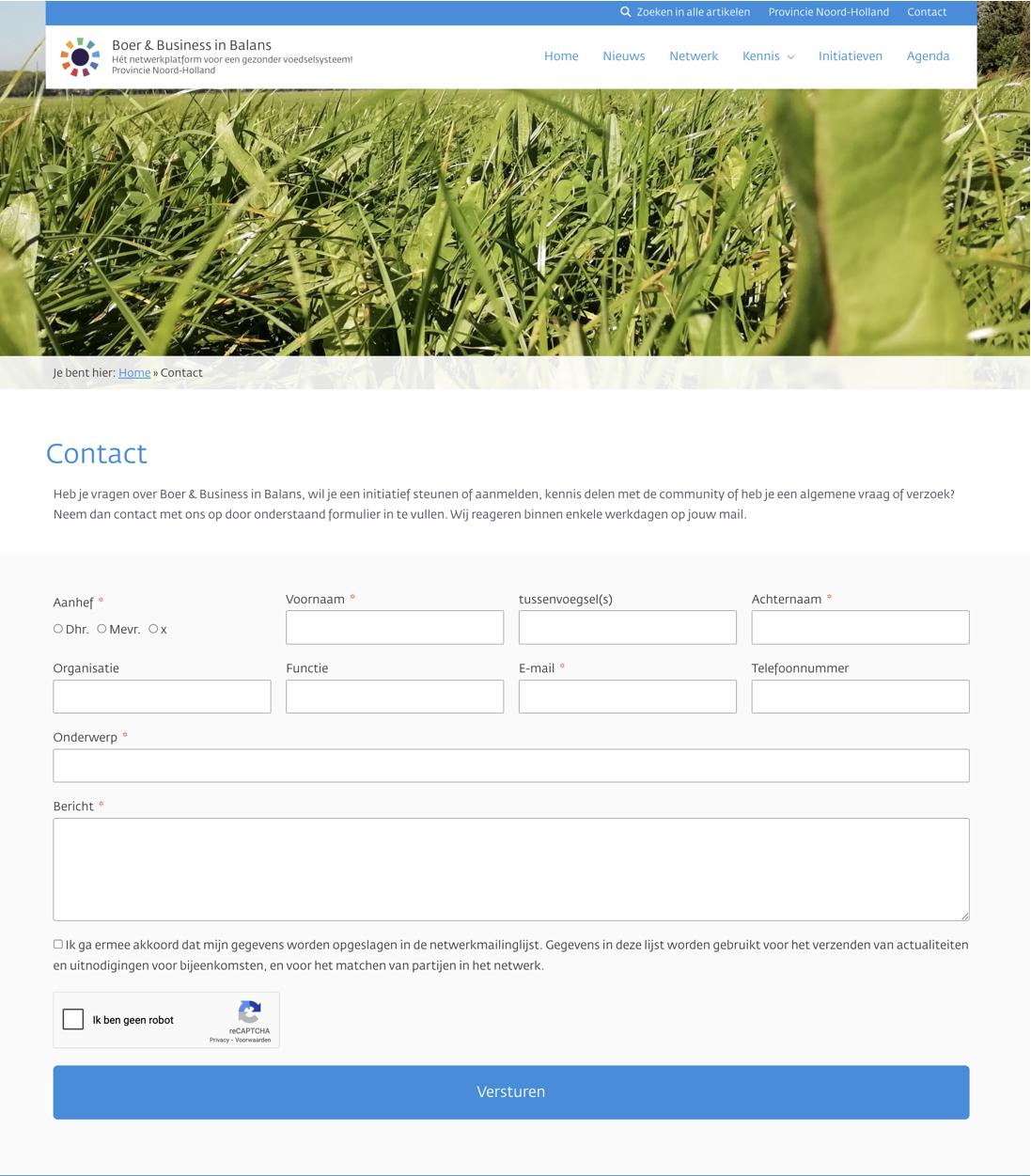 Op de website wordt de blauwe kleur (#288FDF) gebruikt. In combinatie met wit is de contrastratio te laag: 3,5:1. Dit geldt voor teksten in de header zoals “Zoeken in alle artikelen”, “Provincie Noord-Holland” en “Contact”. In de footer geldt dit voor teksten zoals “Boer & Business in Balans is hèt …”, “Nieuws”, “Netwerk” en andere. Op de homepagina https://www.boerenbusinessinbalans.nl/ gaat het om teksten zoals “Naar nieuwsberichten”, “watch the English version here”, “Lees meer”, “Amstelland en Meerlanden” en andere.