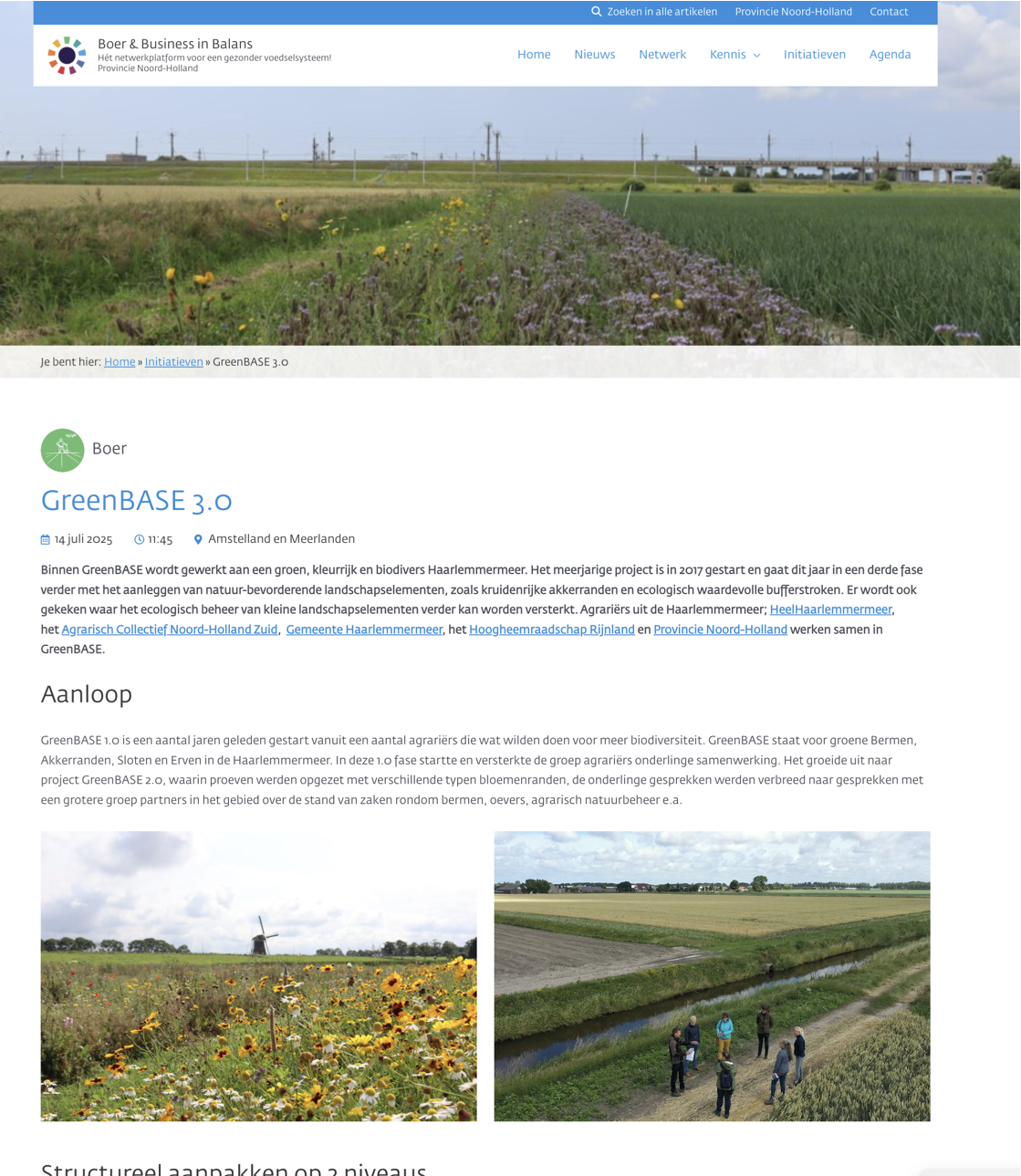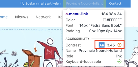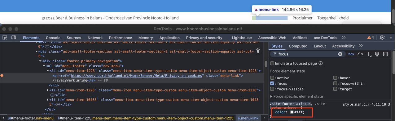In combinatie met donkergrijs (#3A3A3A) is de contrastratio ook te laag: 3,3:1. Dit geldt voor teksten in de footer zoals “Boer & Business in Balans”, “Navigatie” en “Volg ons online!”. In de header en de footer verandert de kleur van de linkteksten naar donkergrijs wanneer deze via het toetsenbord de focus krijgen. Dit geldt voor de links “Zoeken in alle artikelen”, “Provincie Noord-Holland” en “Contact” in de header en voor de links onder de kop “Navigatie” in de footer.