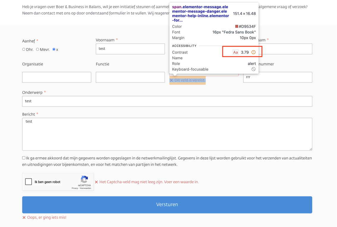 Kleurcontrast van tekst is te laag (tekst kleiner dan 24px en niet vetgedrukt): Dit probleem komt meerdere keren voor op de website en betreft teksten in de header, footer en op de homepagina, evenals foutmeldingen in formulieren. De contrastratio is te laag, waardoor de tekst moeilijk leesbaar is voor gebruikers met visuele beperkingen.