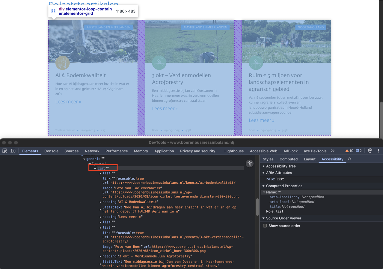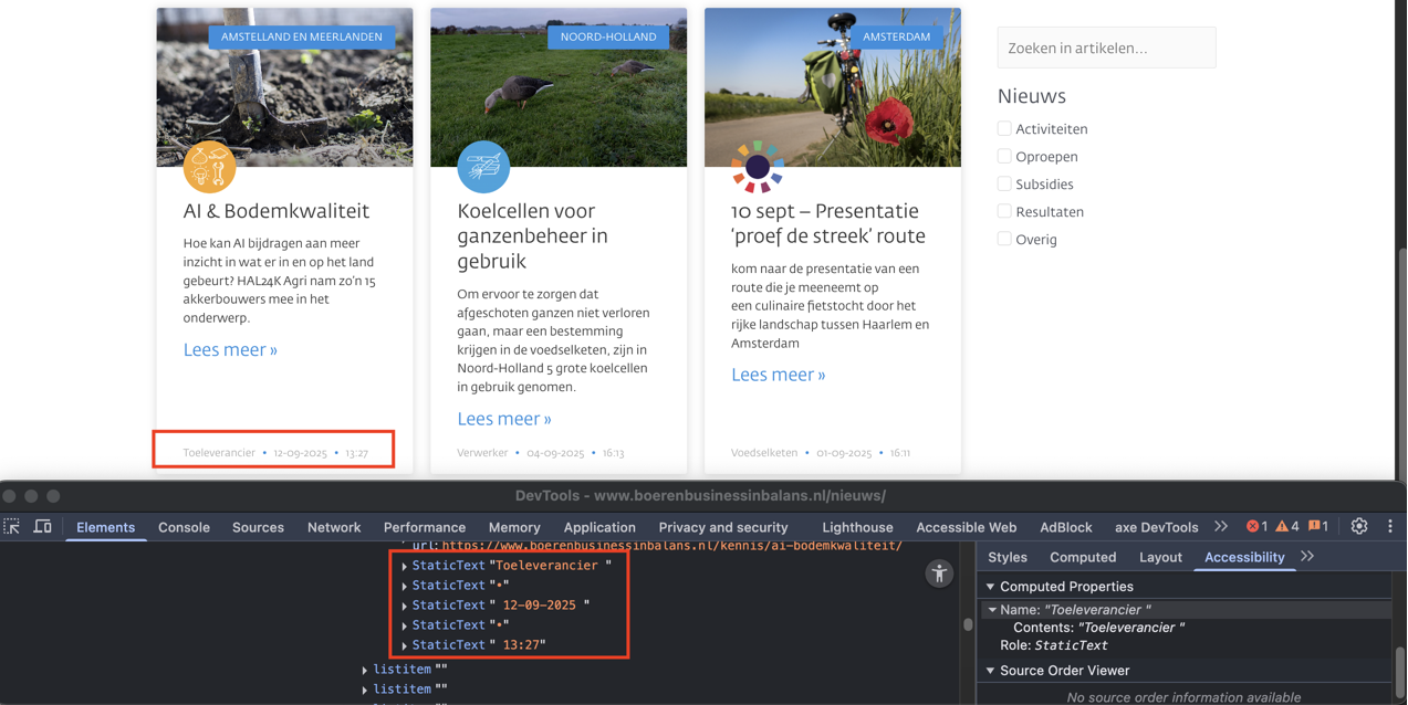 Op deze pagina staan artikelen die ook links zijn. In de artikelen in de buurt van het zoekveld en de selectievakjes staan teksten zoals “Toeleverancier”, “12-09-2025” en “13:27”. Deze teksten lijken visueel bij elkaar te horen, maar deze relatie wordt niet weerspiegeld in de HTML-structuur.