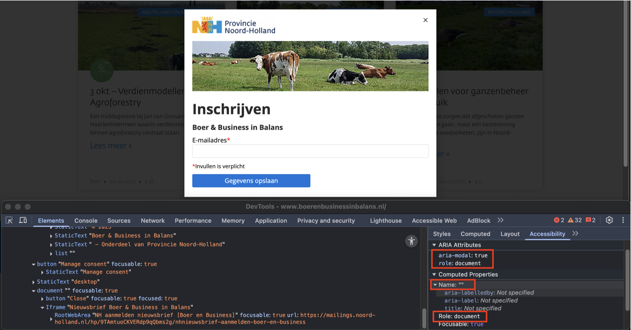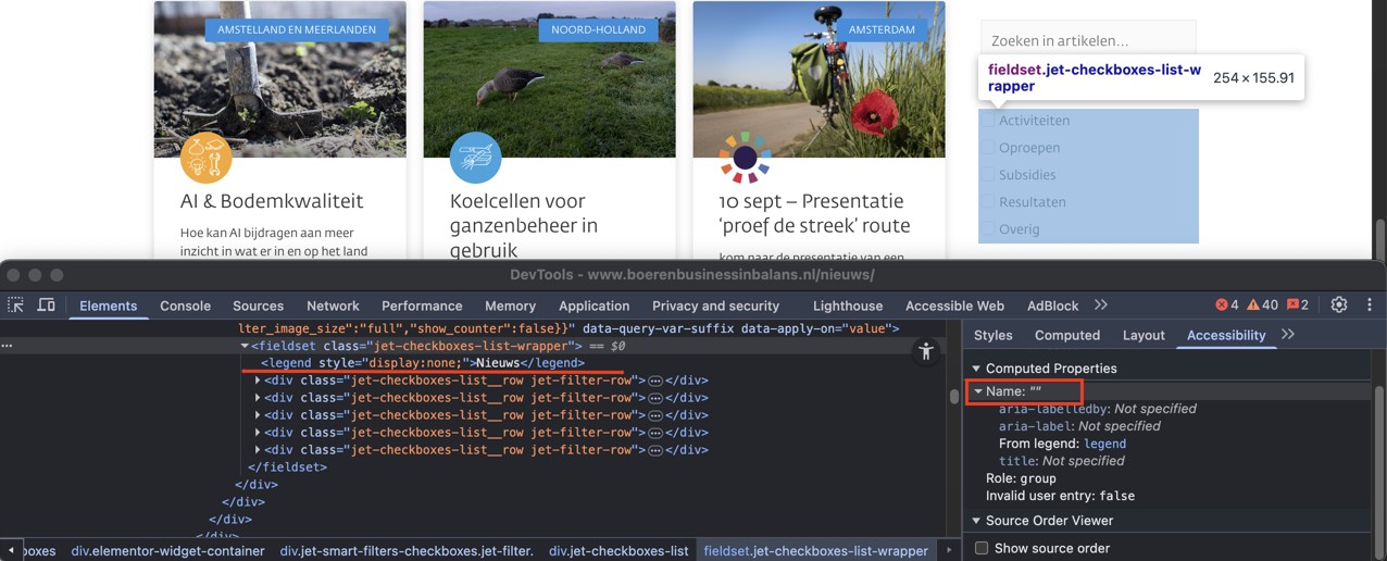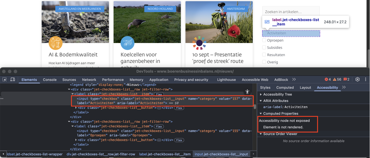 Op deze pagina ontbreken bij de selectievakjes onder “Nieuws” de juiste toegankelijke rol. De input-elementen zijn gebruikt voor deze selectievakjes, maar ze zijn met display:none verborgen voor de schermlezer.
