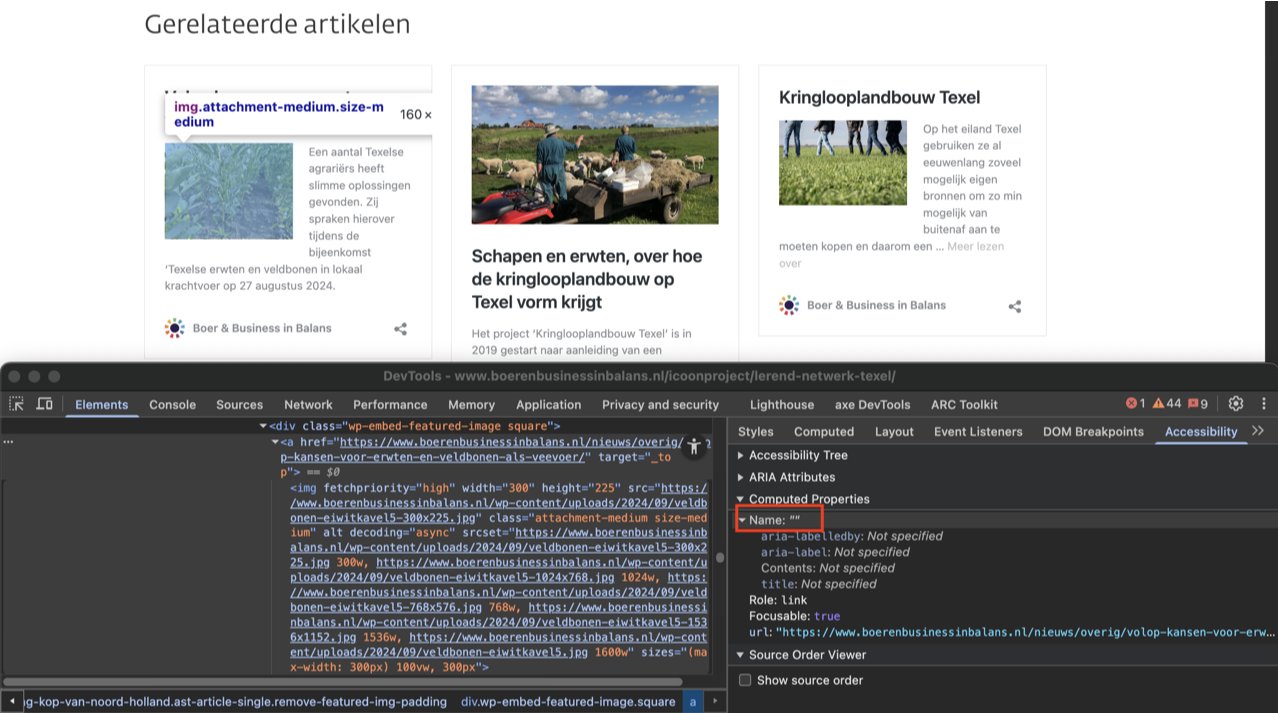 Op deze pagina staan onder de kop “Gerelateerde artikelen” artikelen. De afbeeldingen in deze artikelen functioneren als links. Het alt-attribuut van de afbeeldingen onder “Volop kansen voor erwten en veldbonen als veevoer” en “Kringlooplandbouw Texel” is echter leeg (alt=""), waardoor de afbeelding verborgen blijft voor schermlezers.