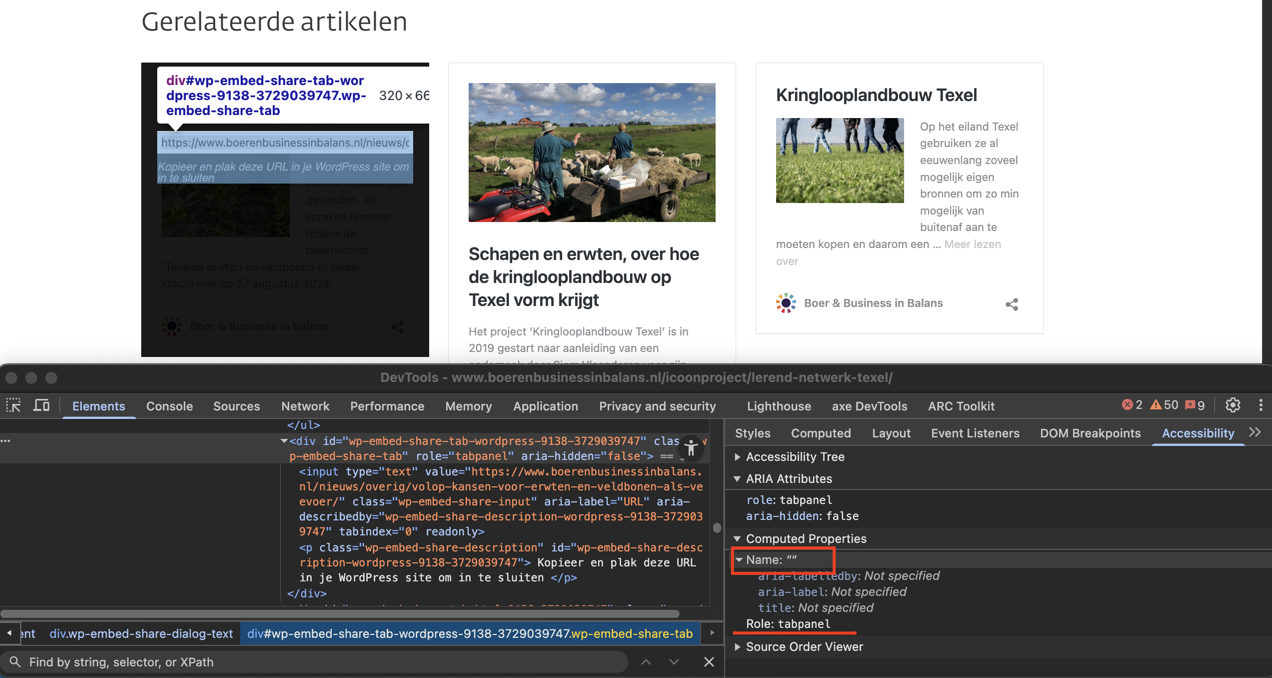 Op deze pagina staan onder de kop “Gerelateerde artikelen” artikelen. Elk artikel bevat een knop met een deel-icoon die een dialoogvenster met deelinstellingen opent. In dit dialoogvenster zijn twee tabbladen aanwezig: “WordPress insluiten” en “HTML insluiten”. De tabpanelen die bij deze tabbladen horen hebben geen toegankelijke namen.