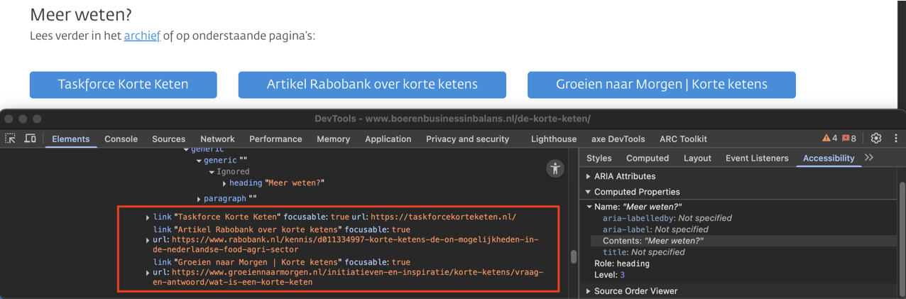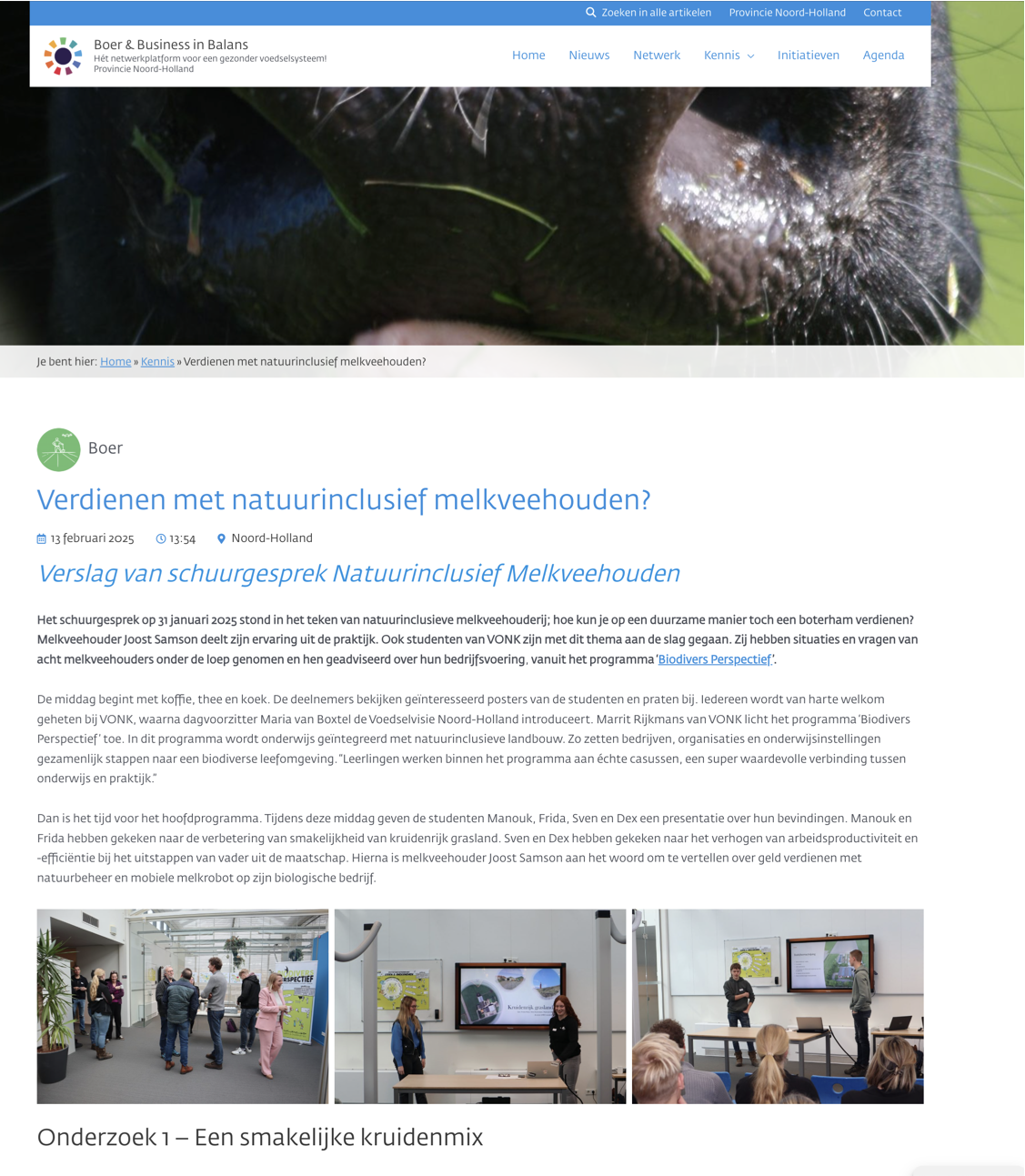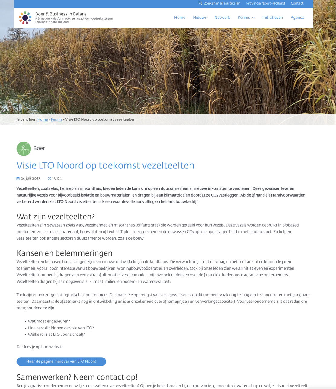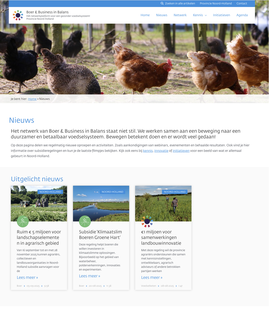 Op deze pagina staan onder de kop “Uitgelicht nieuws” artikelen die ook links zijn. De toegankelijkheidsproblemen die bij deze artikelen zijn vastgesteld, zijn gelijk aan de eerder beschreven problemen bij soortgelijke artikelen op de homepagina https://www.boerenbusinessinbalans.nl/. Deze problemen hebben betrekking op de volgende succescriteria: 1.1.1, 1.3.1, 1.3.2, 1.4.3, 2.4.4 en 4.1.2.