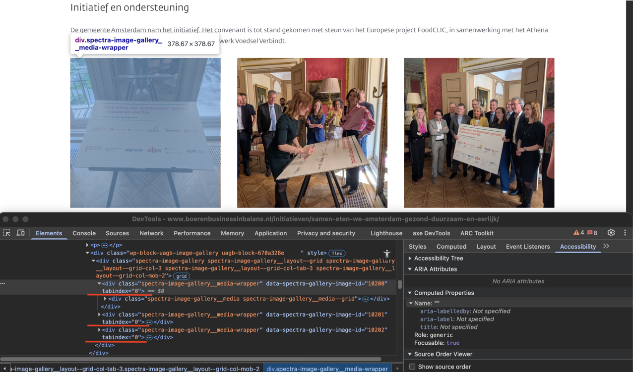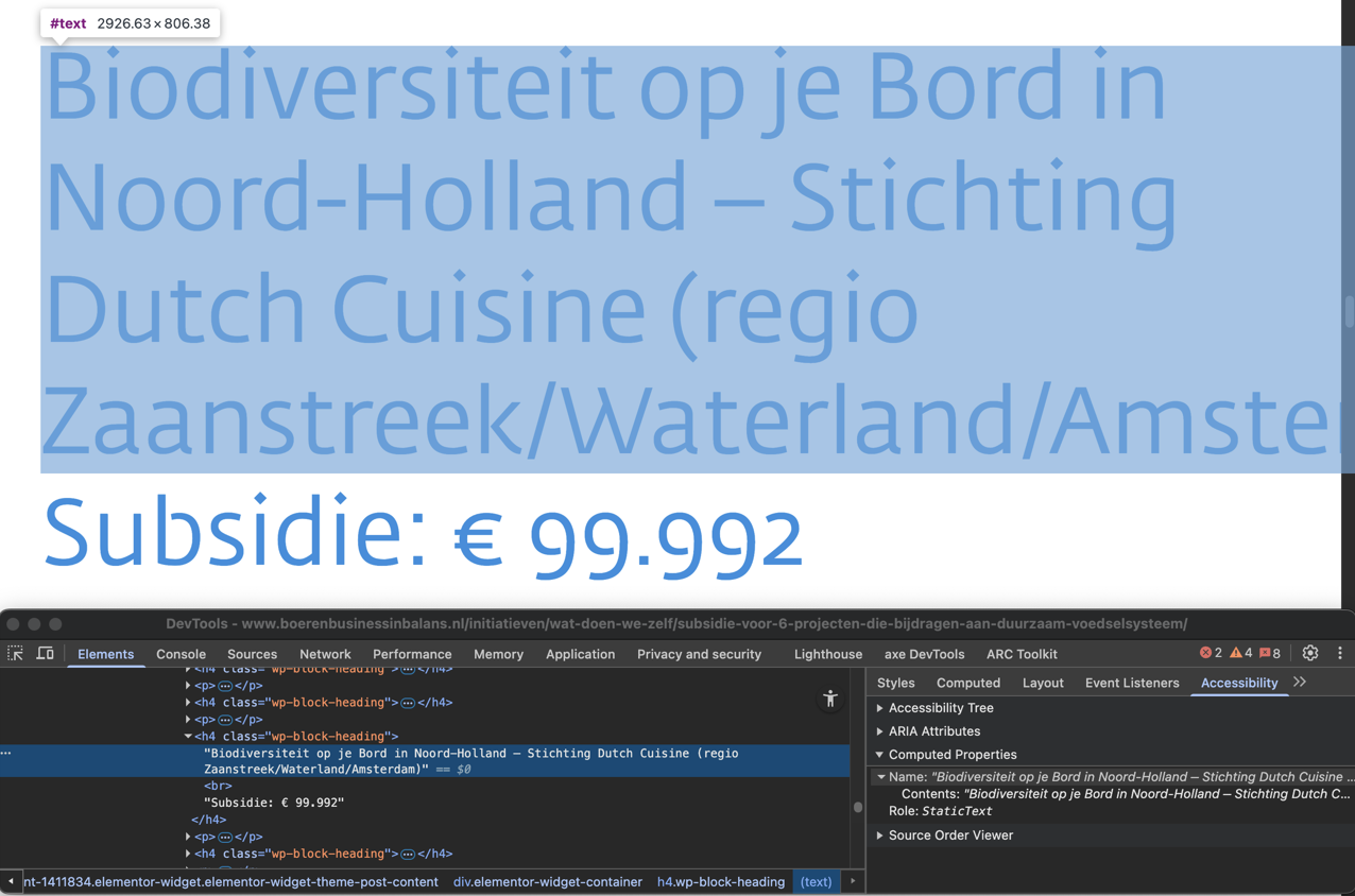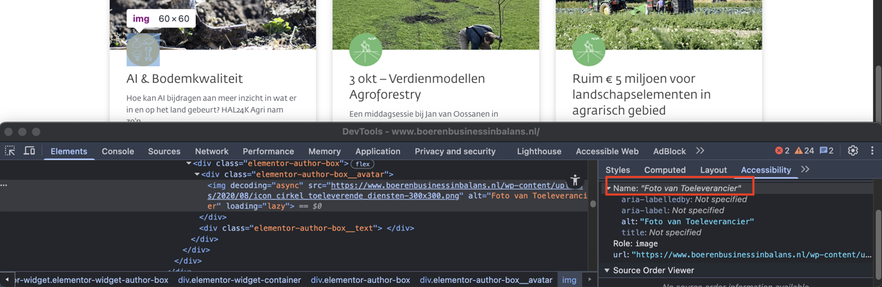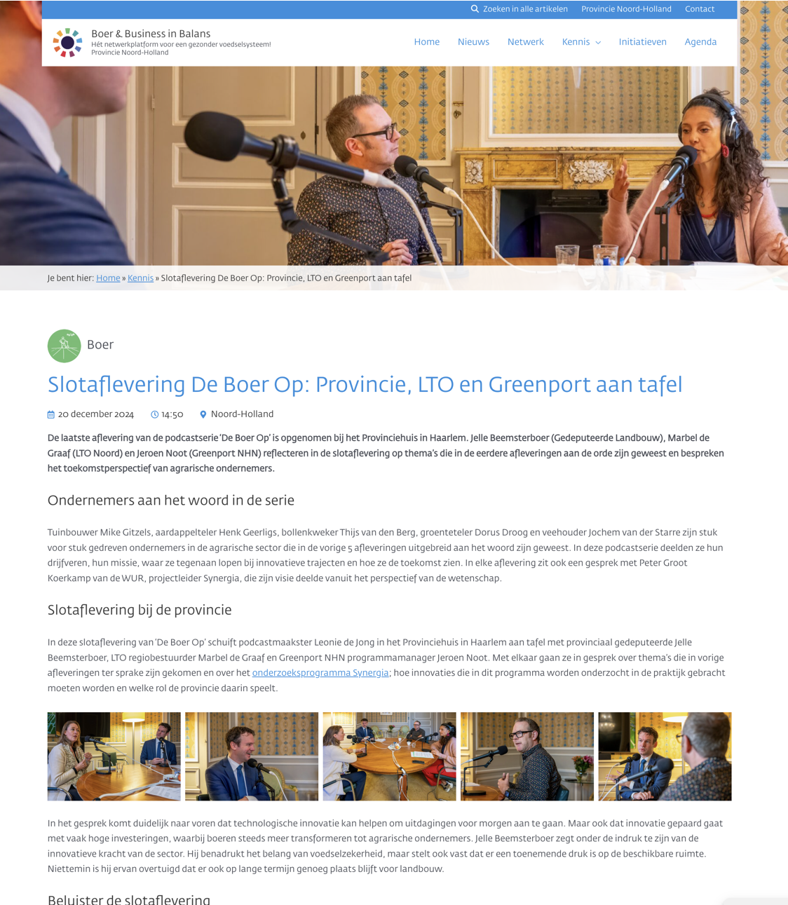 Op deze pagina staan onder de kop “Uitgelicht nieuws” artikelen die ook links zijn. De toegankelijkheidsproblemen die bij deze artikelen zijn vastgesteld, zijn gelijk aan de eerder beschreven problemen bij soortgelijke artikelen op de homepagina https://www.boerenbusinessinbalans.nl/. Deze problemen hebben betrekking op de volgende succescriteria: 1.1.1, 1.3.1, 1.3.2, 1.4.3, 2.4.4 en 4.1.2.