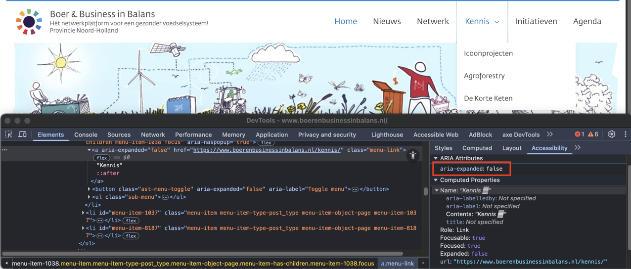 In de header opent de link “Kennis” het submenu. Wanneer deze link toetsenbordfocus krijgt, wordt het submenu automatisch geopend. Het aria-expanded-attribuut op deze link wordt echter niet correct bijgewerkt om de toestand van het submenu weer te geven. Het blijft op “false” staan, ook wanneer het submenu geopend is.