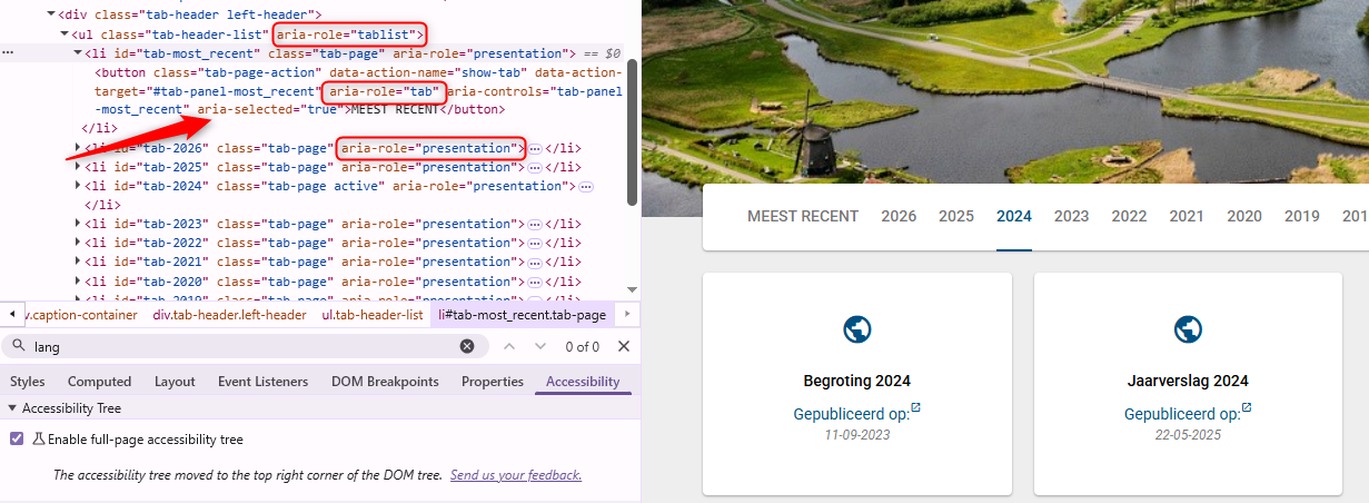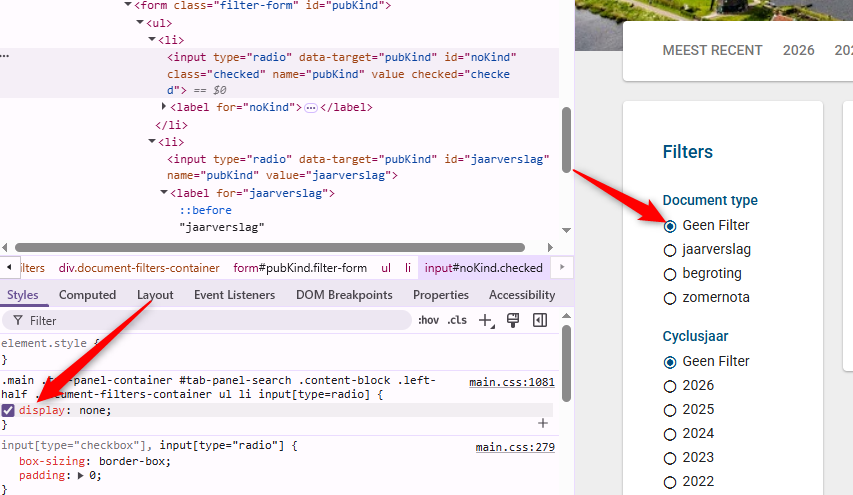 Onjuist gebruik van HTML/ARIA en verborgen interactieve elementen: Er worden onjuiste ARIA-rollen gebruikt in het hoofdmenu, links hebben geen toegankelijke namen, en interactieve filters zijn verborgen voor schermlezers via display:none. Daarnaast ontbreekt het legend-element bij een fieldset en zijn zoekvelden niet consistent gelabeld. Deze technische implementatiefouten verstoren de functionaliteit van de website voor hulpsoftware en spraakbediening.