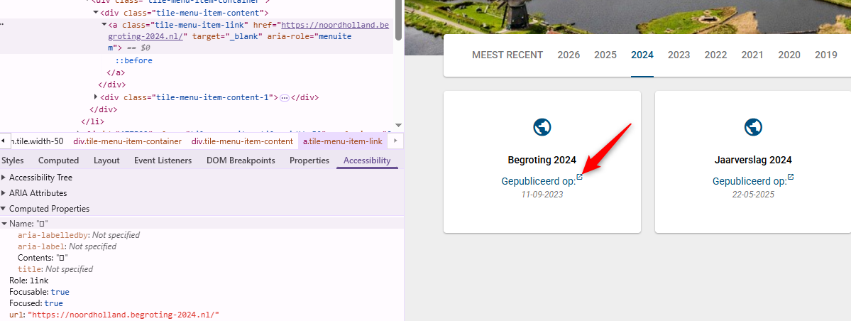 Op alle pagina’s van de website https://noordholland.begroting-2026.nl/ is een skiplink (link om herhalende inhoud over te slaan) aanwezig, maar deze werkt niet goed. De link is wel zichtbaar en met het toetsenbord te bedienen, maar hij verplaatst de focus niet naar de bedoelde plek; de focus blijft bovenaan de pagina.