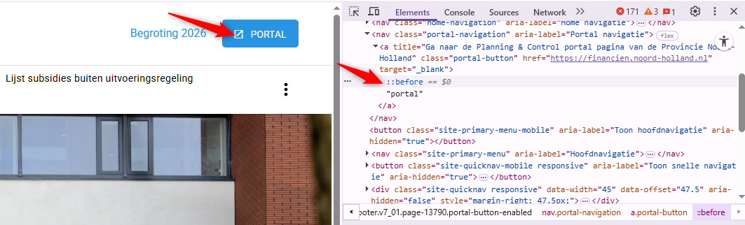 In de header bevat de link met de tekst “Portal” een pictogram dat aangeeft dat de link in een nieuw browsertabblad opent. Dit pictogram heeft echter geen alternatieve tekst, waardoor gebruikers van schermlezers niet weten dat de link in een nieuw tabblad opent.