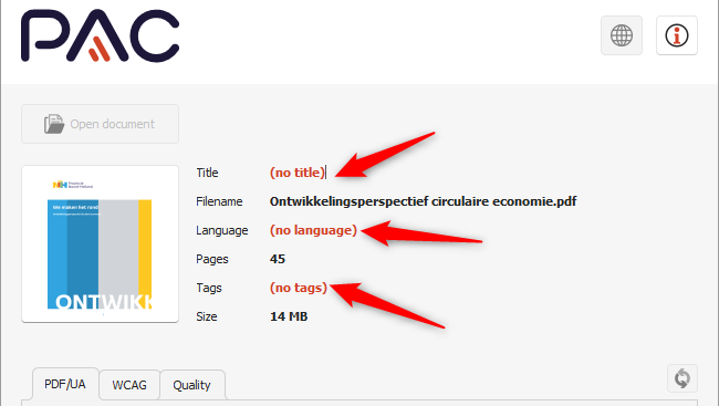 Dit deel van het document kunnen wij hierdoor niet onderzoeken. Het gaat om alle succescriteria die met de pdf-codelaag te maken hebben, zoals semantische koppen en alternatieve teksten bij afbeeldingen. Als je dit oplost, is het dus mogelijk dat er nieuwe toegankelijkheidsproblemen ontstaan die nu nog niet aan het licht zijn gekomen.
