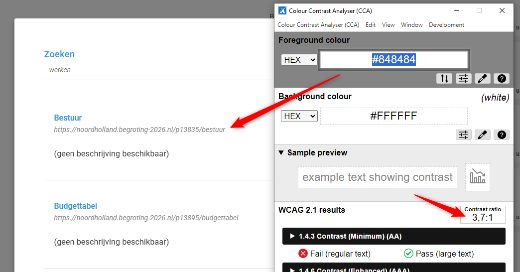 Kleurcontrast van tekst is te laag (tekst kleiner dan 24px en niet vetgedrukt)