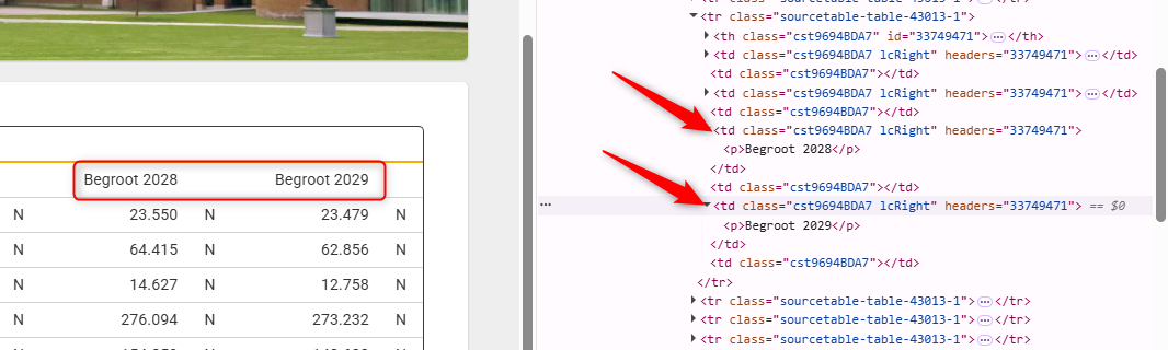 Op deze pagina staat een tabel. De HTML-opmaak van de tabel gebruikt de elementen th, td en tr verkeerd. Kolomkoppen zijn niet gemarkeerd als th, terwijl tussengevoegde rijen met totalen juist als th in plaats van td zijn gemarkeerd. Dit is een verkeerd gebruik van de tabel-elementen en zorgt voor verwarring, omdat schermlezers de relatie tussen cellen niet correct kunnen voorlezen. De algemene structuur en de onderlinge relaties in de tabel zijn onduidelijk.