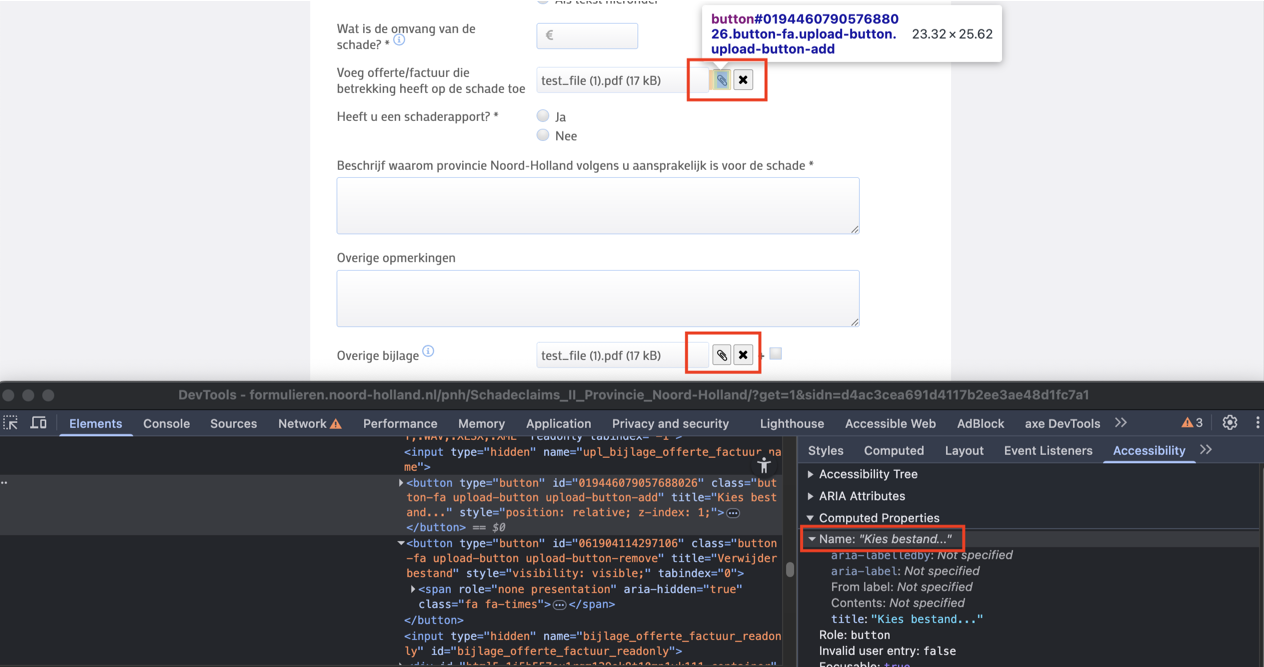 Deze pagina bevat knoppen met een paperclip-icoon. De toegankelijke namen van deze knoppen zijn hetzelfde: “Kies bestand”. Deze knoppen voeren echter verschillende functies uit, namelijk het toevoegen van bestanden voor verschillende secties.