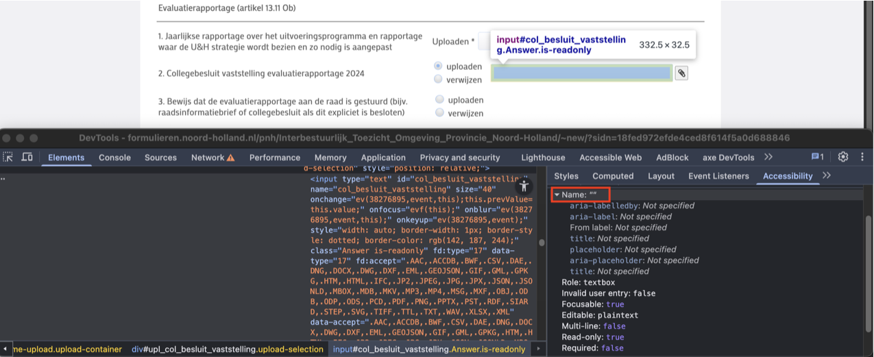 Voor schermlezers wordt dit input-veld aangekondigd als een tekstveld waarin tekst getypt kan worden, waardoor niet duidelijk is dat het bedoeld is voor het uploaden van een bestand. Dit zorgt voor verwarring en kan ertoe leiden dat het formulier niet correct wordt ingevuld.