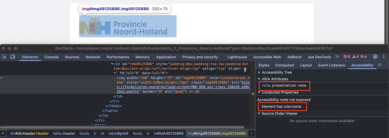 Daarnaast heeft dit logo het attribuut role="presentation none". De ARIA-rollen role="none" en role="presentation" geven aan hulpsoftware zoals schermlezers de instructie om de semantische rol van het element te negeren. Bij een img-element met role="none" of role="presentation" wordt de afbeelding volledig genegeerd. Daardoor heeft het element geen rol, geen naam en wordt het helemaal niet aangekondigd.