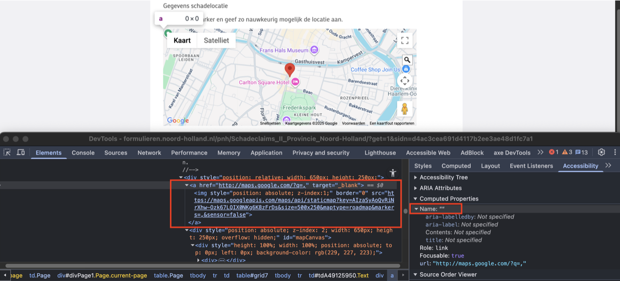 Op deze pagina, in de sectie "Gegevens schadelocatie", staat een link die visueel verborgen is maar toegankelijk is voor schermlezers. Deze link heeft geen toegankelijke naam.