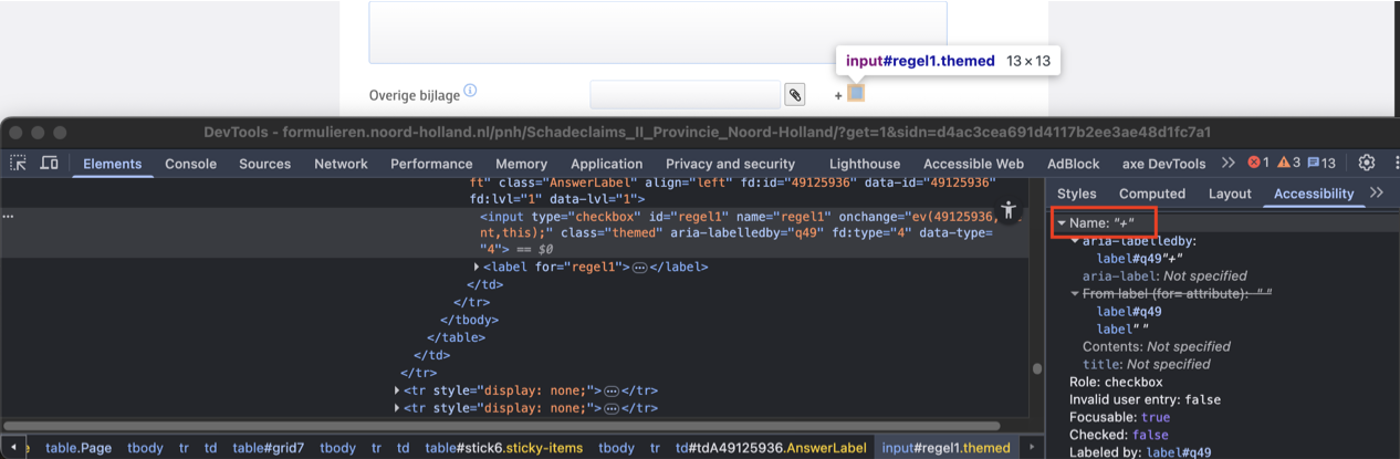 Op deze pagina heeft het selectievakje naast het veld “Overige bijlage” het label “+” en is de toegankelijke naam ervan ook “+”. Deze naam beschrijft de functie van het element niet nauwkeurig.