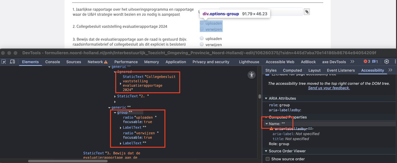 Zorg dat de groepslabels in de code expliciet gekoppeld zijn aan de groepen keuzerondjes. Dit kan gedaan worden met aria-labelledby dat verwijst naar het element dat de tekst van het groepslabel bevat.