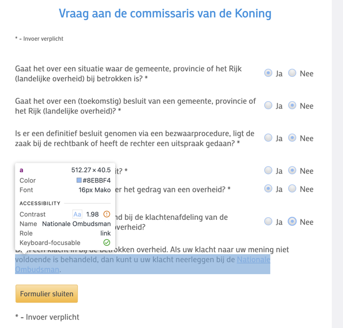 Op alle pagina’s staan uitroepteken-iconen die een tooltip tonen bij hover en een dialoogvenster openen wanneer ze geactiveerd worden. Deze interactieve elementen hebben geen correcte ARIA-rol en geen toegankelijke naam. Zie bijvoorbeeld de pagina https://formulieren.noord-holland.nl/pnh/Schadeclaims_II_Provincie_Noord-Holland naast “Soort claim”, “Datum schade”, “Wat is de omvang van de schade?”, “Overige bijlage” en andere velden.