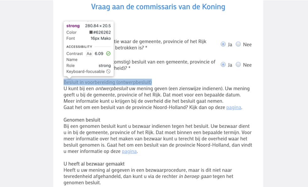 Op deze pagina zijn de volgende teksten onjuist gemarkeerd met strong in plaats van met een correcte kop: “Besluit in voorbereiding (ontwerpbesluit)”, “Genomen besluit” en “U heeft al bezwaar gemaakt”.