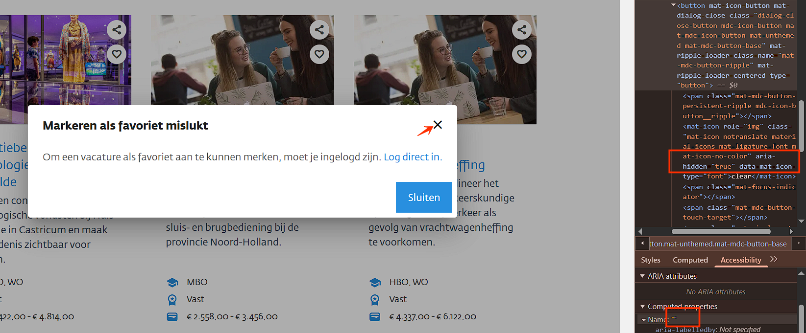 Informatieve elementen zijn verborgen: Iconen die belangrijke informatie overbrengen (zoals een hart-icoon of een kruisje om een dialoogvenster te sluiten) zijn verborgen voor schermlezers met aria-hidden="true". Dit betekent dat gebruikers van schermlezers deze cruciale informatie missen en de functionaliteit van de elementen niet kunnen begrijpen.