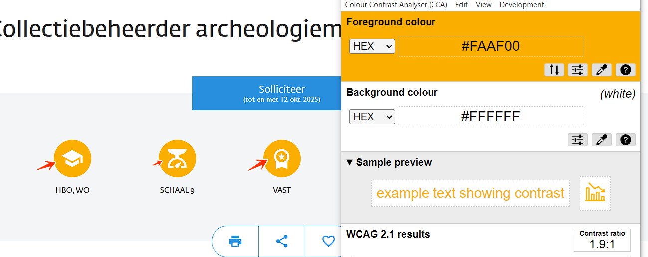 Op deze pagina staan onder “Collectiebeheerder archeologiemuseum Huis van Hilde” informatieve iconen. De witte iconen tegen de oranje (#FAAF00) achtergrond hebben een contrastverhouding van 1,9:1, wat lager is dan de vereiste 3,0:1 voor grafische elementen die informatie overbrengen. Het kleurcontrast van informatieve iconen moet minimaal 3,0:1 zijn.