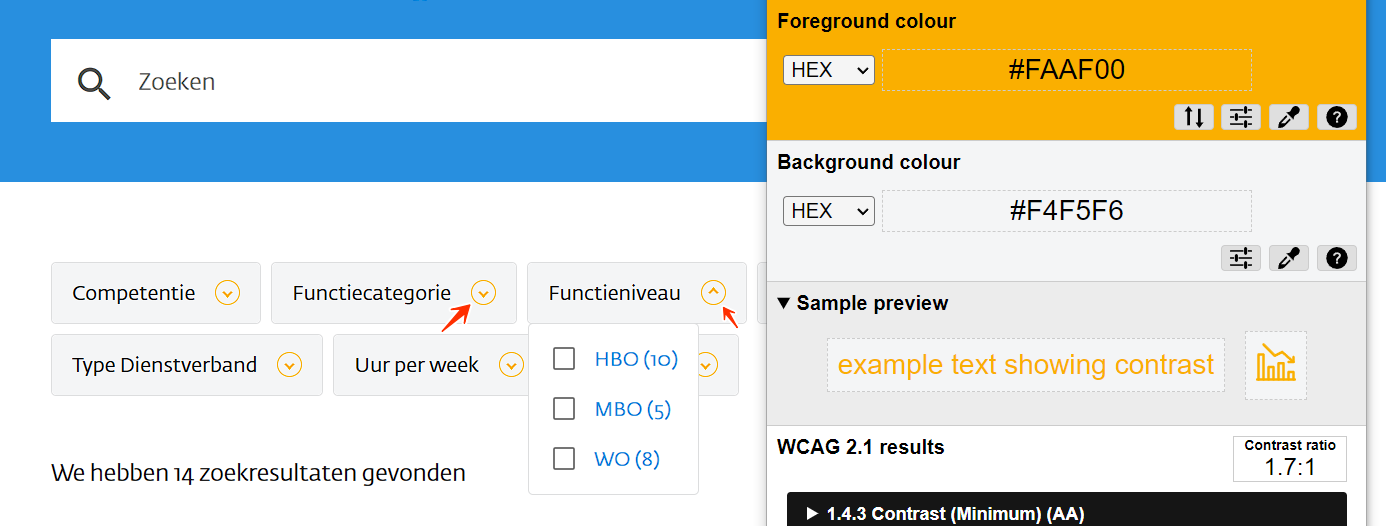 Op deze pagina staan er onder het zoekveld secties met verborgen inhoud. Deze secties hebben informatieve pijltjes-icoontjes die aangeven dat de secties geopend kunnen worden. De gele (#FAAF00) iconen tegen de grijze (#F4F5F6) achtergrond hebben een contrastverhouding van 1,7:1, wat lager is dan de vereiste 3,0:1 voor grafische elementen die informatie overbrengen. Het kleurcontrast van informatieve iconen moet minimaal 3,0:1 zijn.