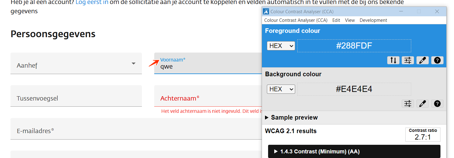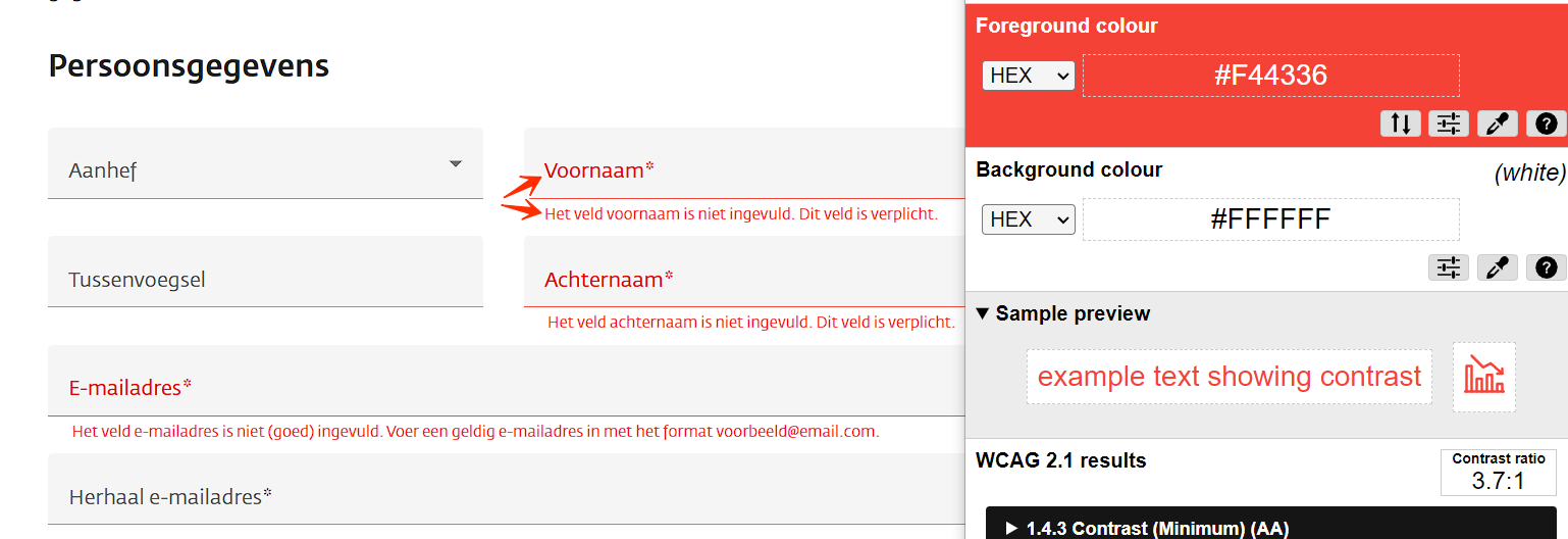 Op deze pagina staat onder de kop “Persoonsgegevens” een formulier. De foutmelding in dit formulier is rode (#F44336) tekst op een witte achtergrond, bijvoorbeeld: “Het veld voornaam is niet ingevuld. Dit veld is verplicht.”. De contrastverhouding is 3,7:1. Foutmeldingen moeten, net als andere teksten, voldoen aan de minimale contrasteisen.