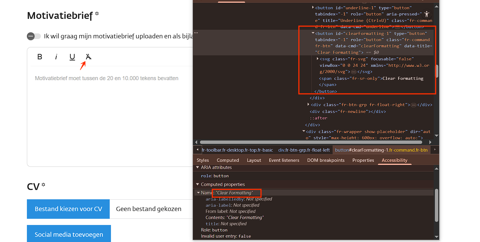 Op deze pagina staan onder de kop “Motivatiebrief” knoppen. De toegankelijke namen van deze knoppen zijn in het Engels geschreven, bijvoorbeeld “Clear Formatting”. Deze teksten worden voorgelezen door schermlezers volgens de uitspraakregels van de primaire taal van de pagina (in dit geval Nederlands).