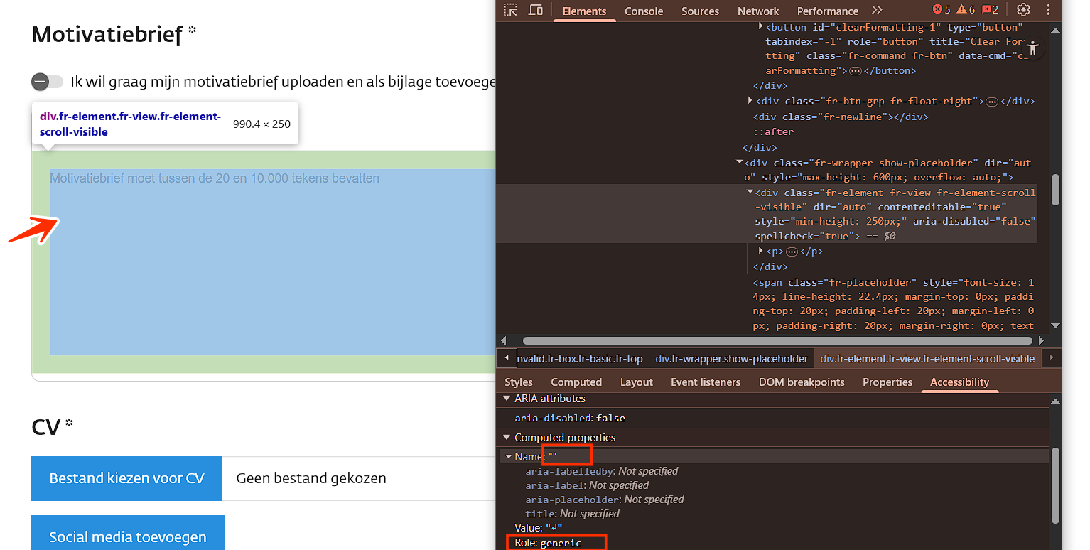 Op deze pagina staat er onder de heading “Motivatiebrief” een invoerveld. Dit invoerveld mist een correcte toegankelijke rol en een toegankelijke naam. Elk HTML-element heeft een rol. Dit betekent dat het element bepaalde eigenschappen en functies heeft om informatie aan de bezoeker te geven of om informatie van de bezoeker te ontvangen. De rol bepaalt dus wat het element doet. Schermlezers en andere hulpmiddelen moeten de correcte rol van elk element op een webpagina kennen. Zo kunnen ze op een slimme manier met het element omgaan en aan de bezoeker uitleggen wat het element doet.