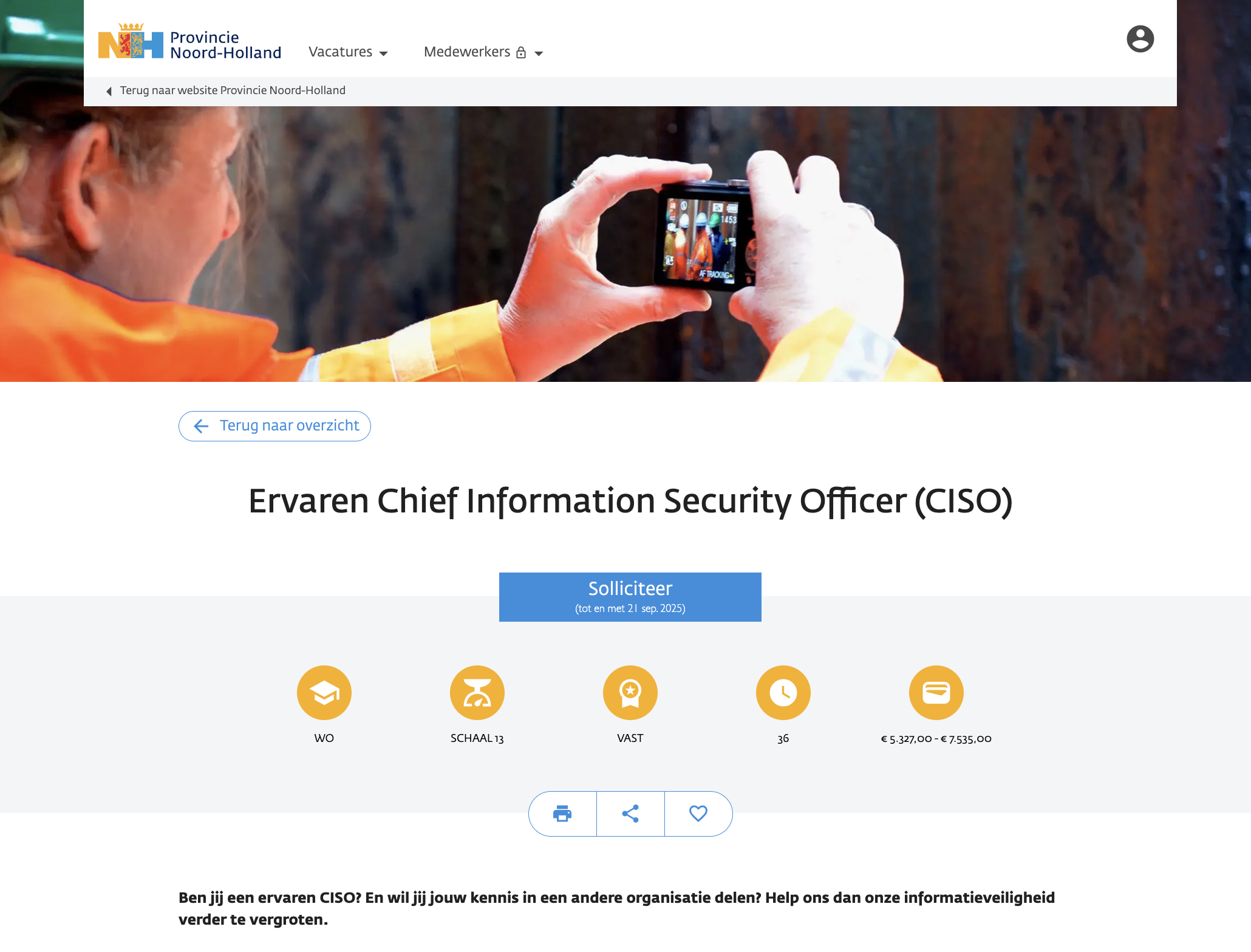 Link naar pagina: https://vacatures.noord-holland.nl/vacatures/ervaren-chief-information-security-officer-ciso/c04b011c-9124-4b2f-86e8-784924d31440