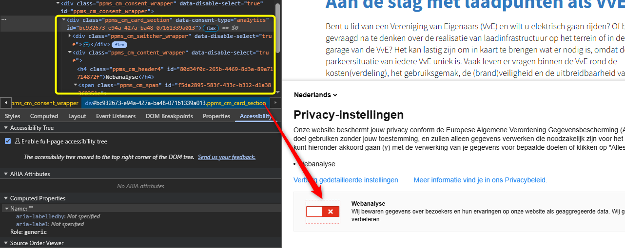 In de cookiebanner wordt extra inhoud getoond na een klik op de knop “Toon gedetailleerde instellingen”. Het selectievakje “Webanalyse” heeft geen rol, geen toegankelijke naam (SC 4.1.2) en is niet met het toetsenbord te bedienen (SC 2.1.1).