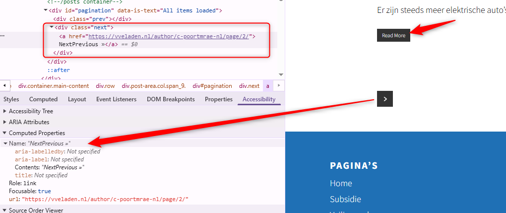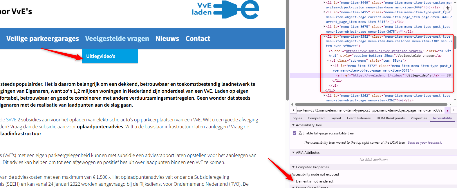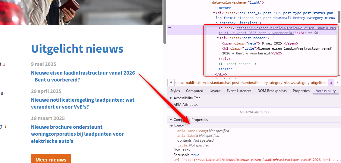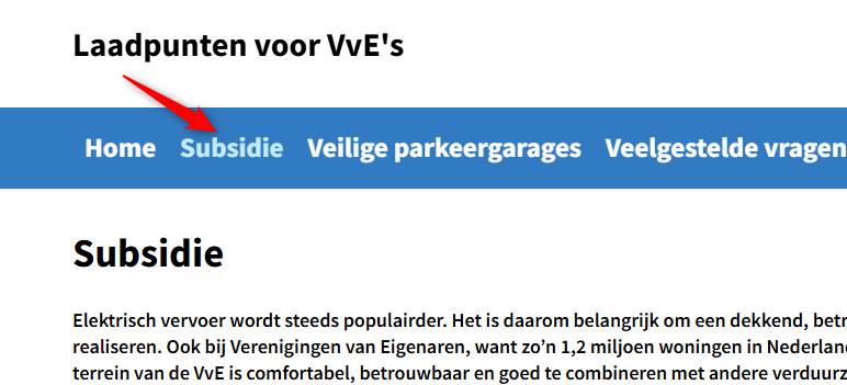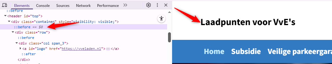 In de header is de tekst “Laadpunten voor VvE’s” verborgen voor schermlezers. Deze tekst is toegevoegd met CSS-eigenschap ::before. Deze code maakt de inhoud onzichtbaar voor screenreaders en mag niet worden gebruikt voor informatieve elementen of interactieve functionaliteit. Hierdoor wordt de inhoud ontoegankelijk voor bezoekers die afhankelijk zijn van hulpsoftware.