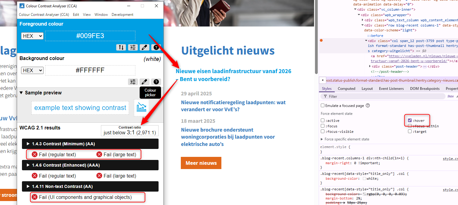 Onvoldoende kleurcontrast: dit probleem komt opvallend vaak voor op diverse onderdelen van de website, waaronder de cookiebanner, links, koppen en datums. Dit maakt de content moeilijk leesbaar voor mensen met visuele beperkingen of kleurenblindheid.