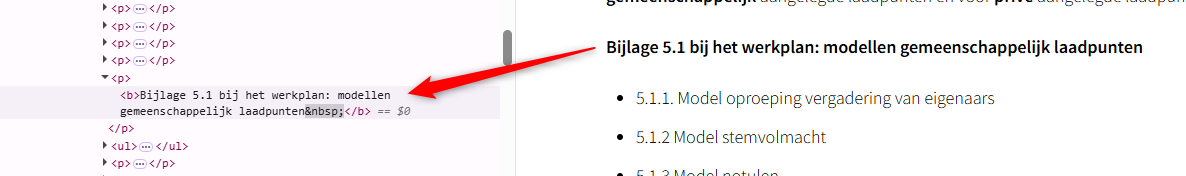 Op deze pagina zijn de volgende teksten onjuist gemarkeerd met strong in plaats van met correcte heading-elementen: “Oplaadpuntenadvies”, “Basislaadinfrastructuur” en “Meer weten?”.