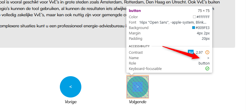Werk de toegankelijke namen bij (bijvoorbeeld met aria-label) zodat deze de functie van de knoppen correct weergeven, bijvoorbeeld “Ga naar de vorige stap” en “Ga naar de volgende stap”.