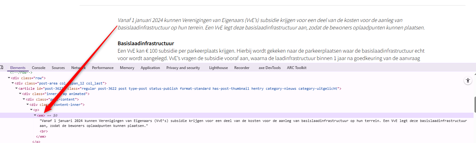 Op deze pagina onder de kop "Nieuwe subsidie voor basislaadinfrastructuur bij VvE’s" wordt het em-element gebruikt voor opmaakdoeleinden. De hele paragraaf is in een em-element geplaatst.