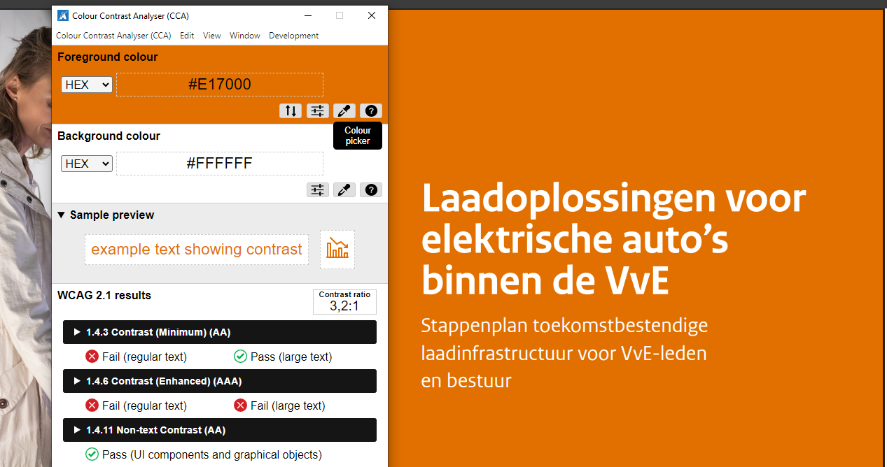 Op sommige pagina’s wordt tekst in dezelfde oranje kleur gebruikt op een lichtoranje (#F9E2CC) achtergrond. De contrastratio is in dit geval 2,6:1, wat zowel voor kleine als voor grote teksten onvoldoende is. Voorbeelden hiervan zijn de tekst “Fase I Voorbereiding” op pagina 3, de teksten in de eerste rij van de tabel op pagina 5, de tekst “Hoe worden laadpunten aangesloten?” op pagina 15 en andere pagina’s.