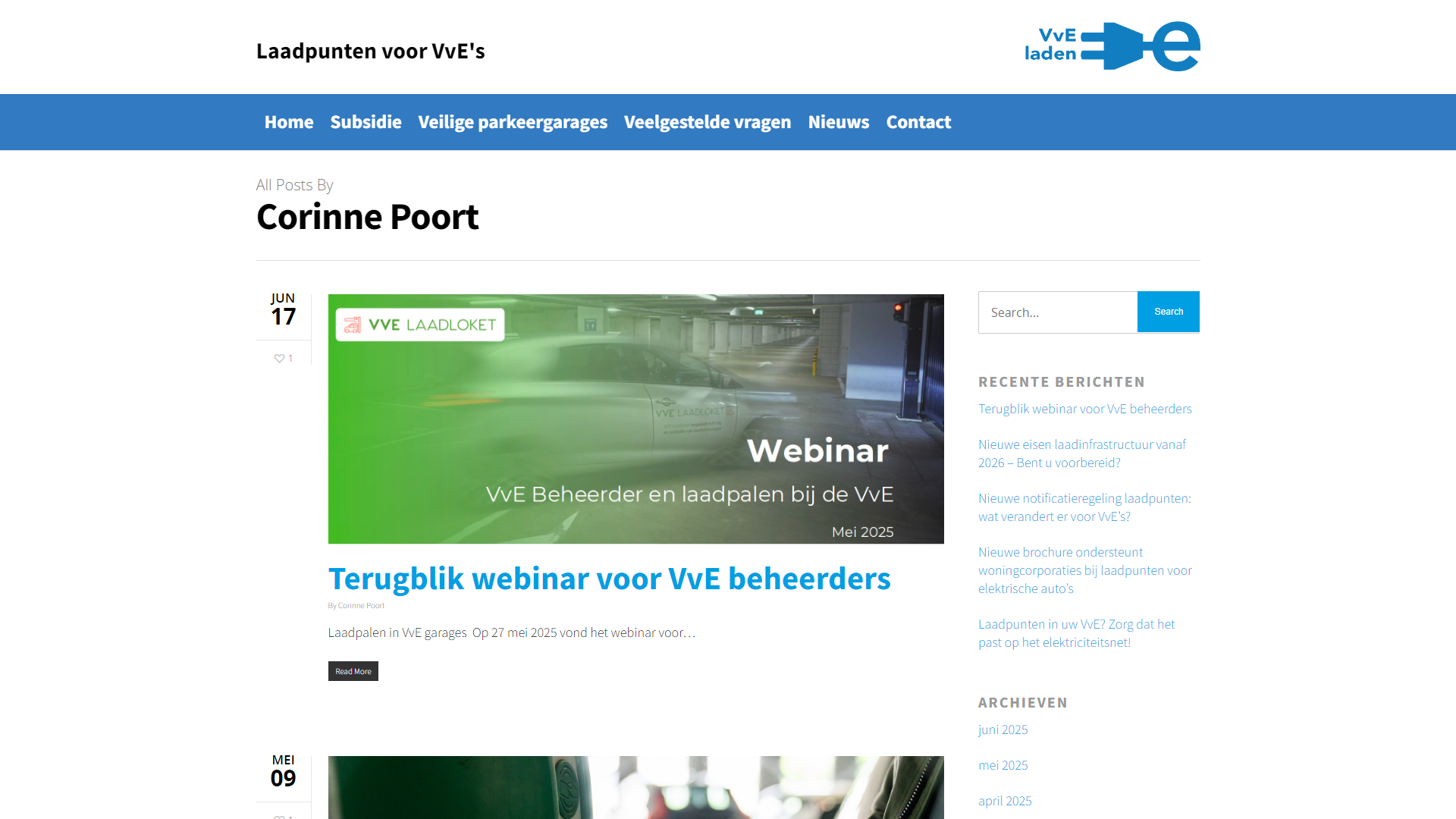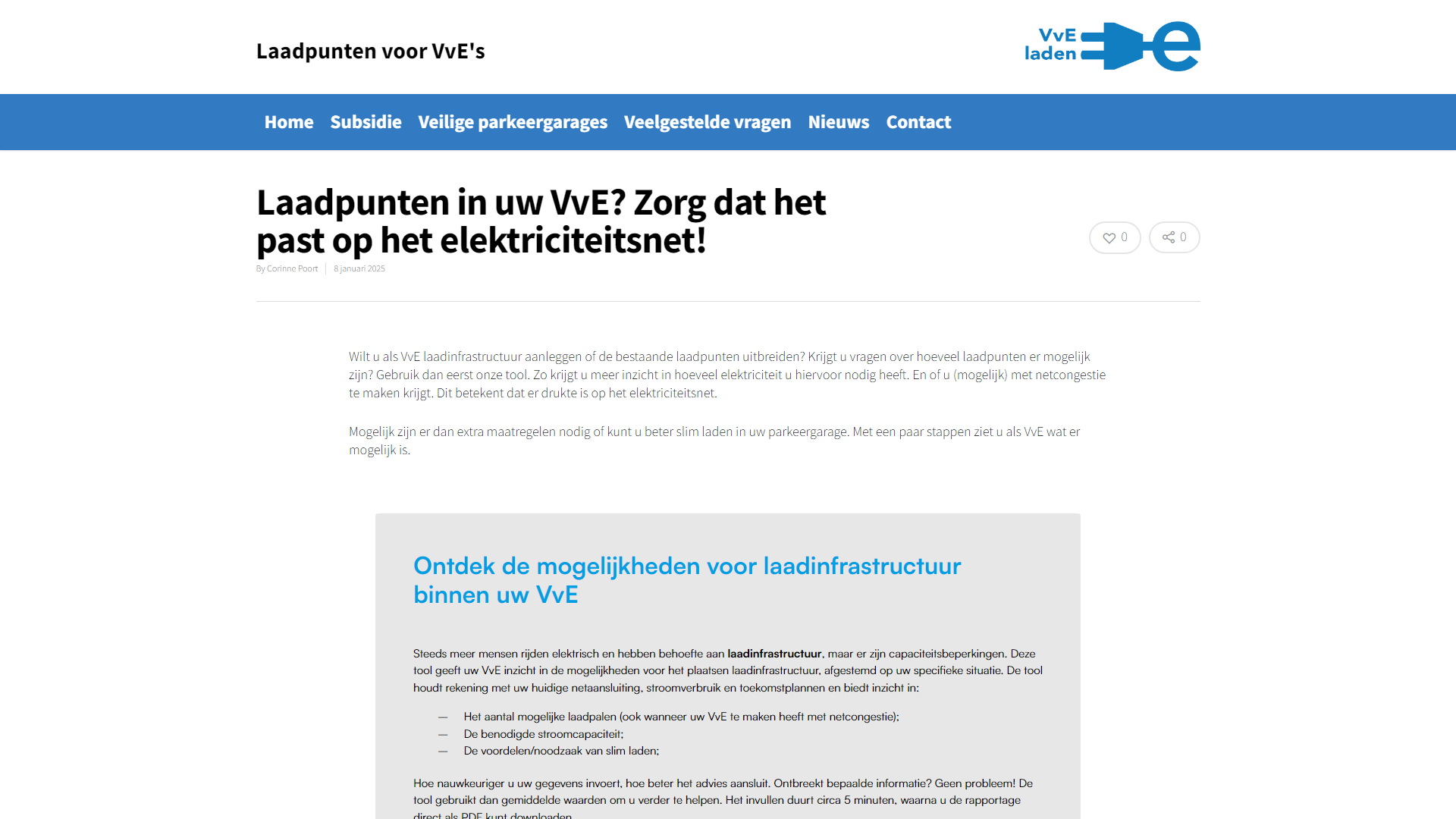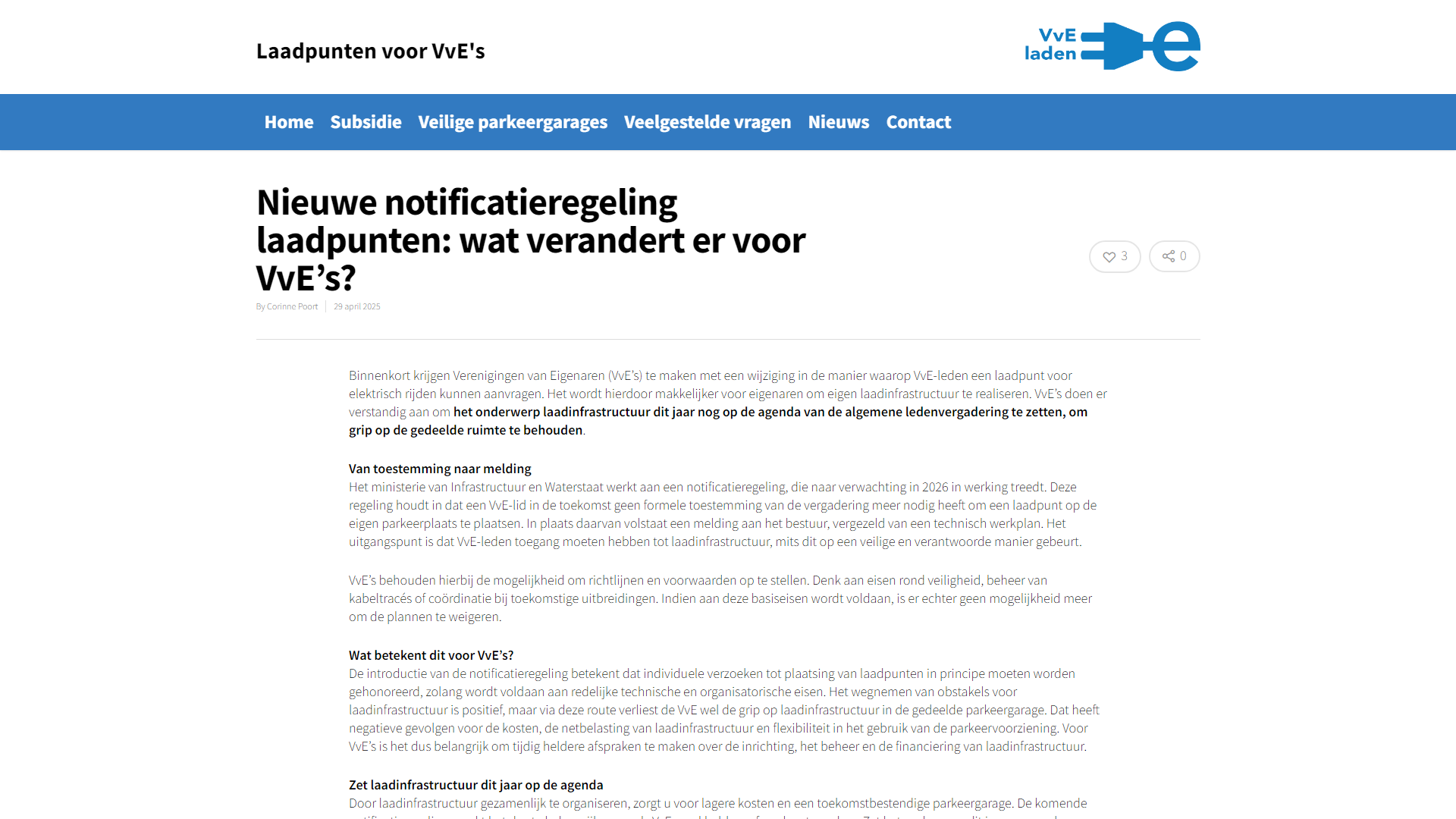 Op deze pagina staat onder de kop “Nieuwe notificatieregeling laadpunten: wat verandert er voor VvE’s?” de tekst “By Corinne Poort | 29 april 2025”. De tekst is grijs (#888888) op een witte achtergrond en heeft een contrastratio van 3,5:1.