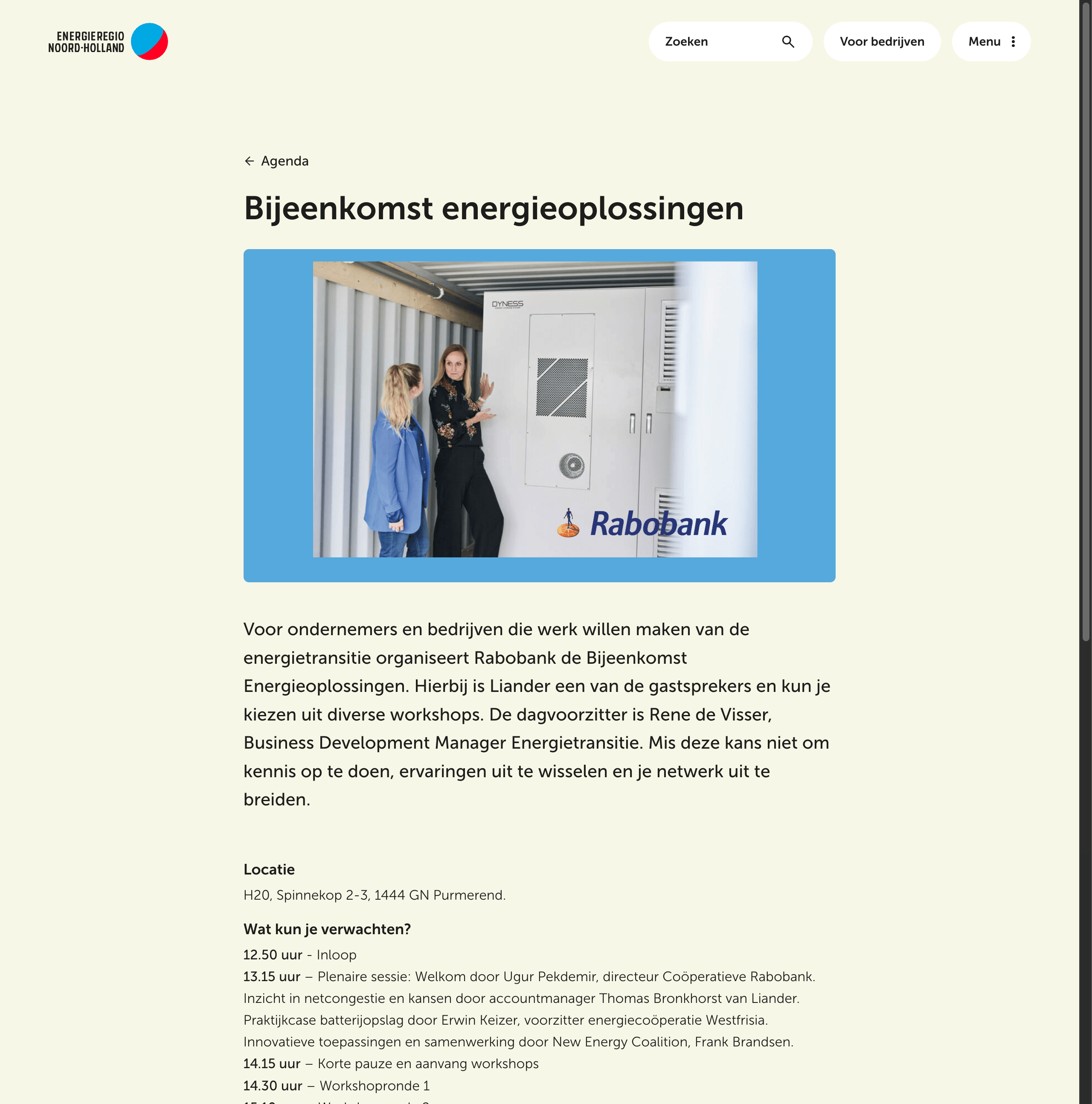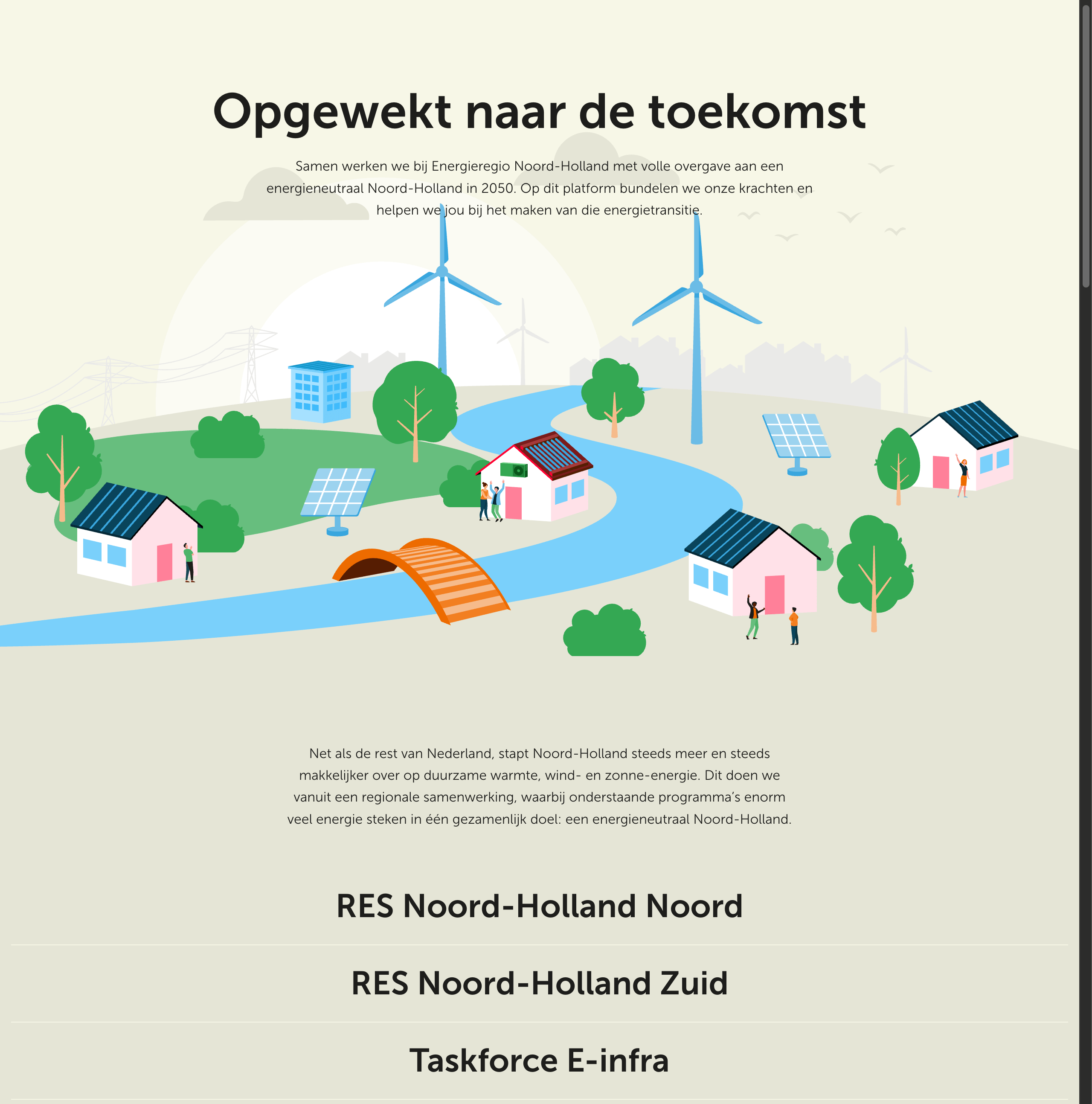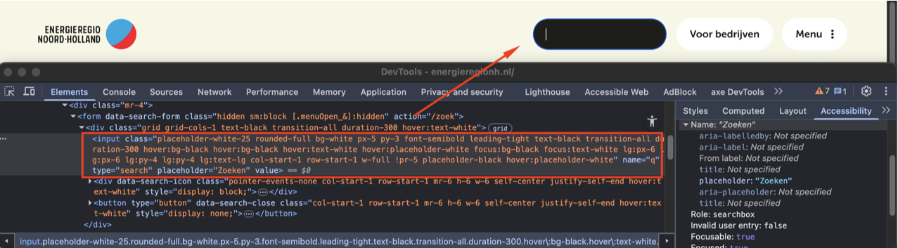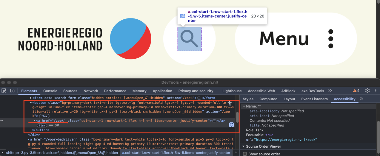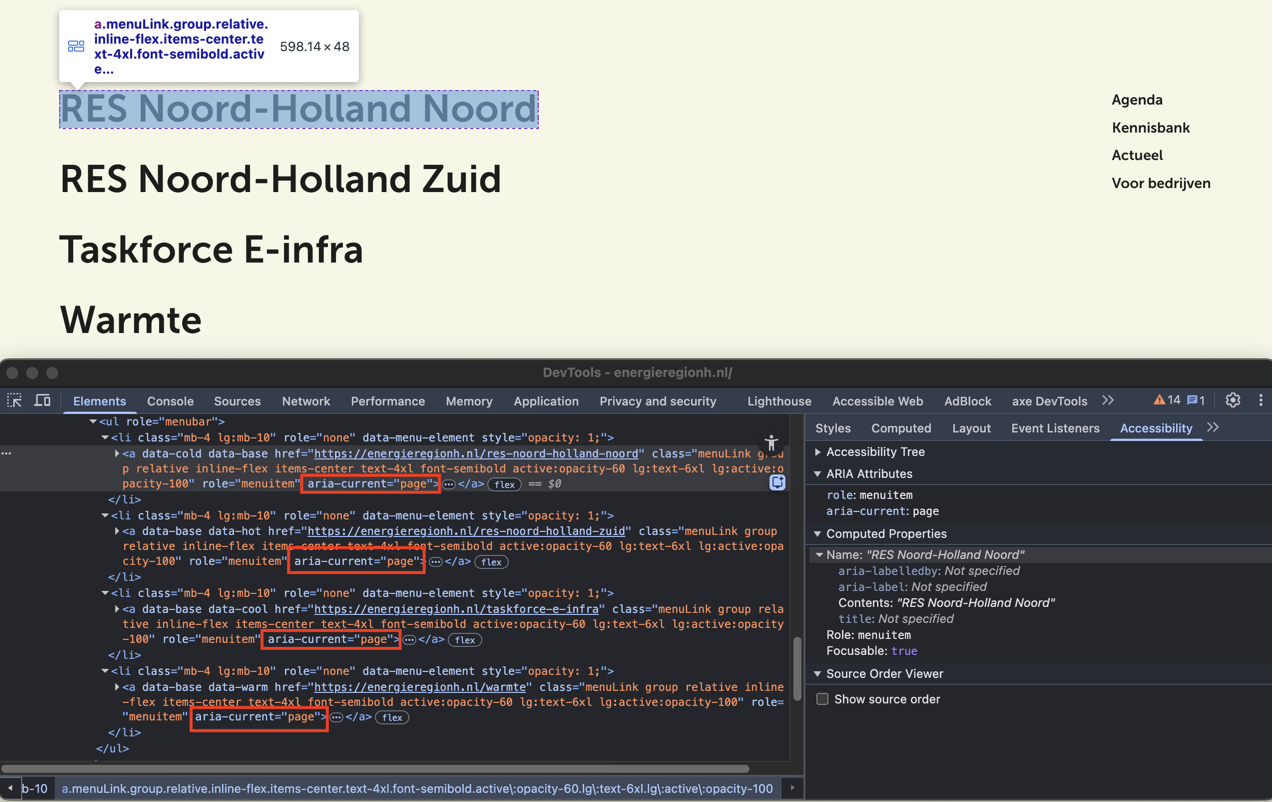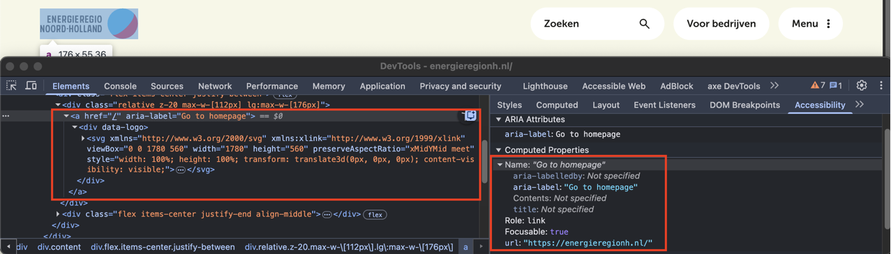 Het logo bovenaan de website toont de volledige tekst "Energie regio Noord-Holland", maar het tekstalternatief is “Go to homepage”, afkomstig van het aria-label-attribuut. Het aria-label-attribuut bevat dus tekst in het Engels.