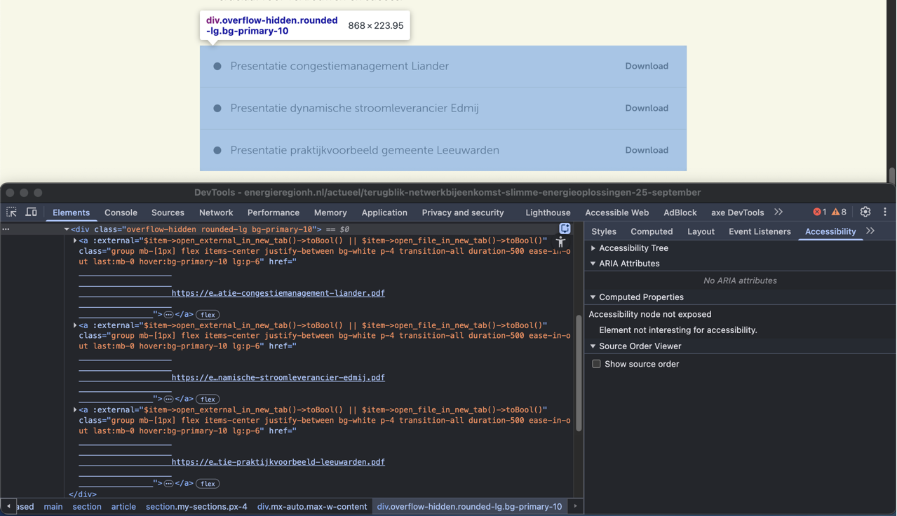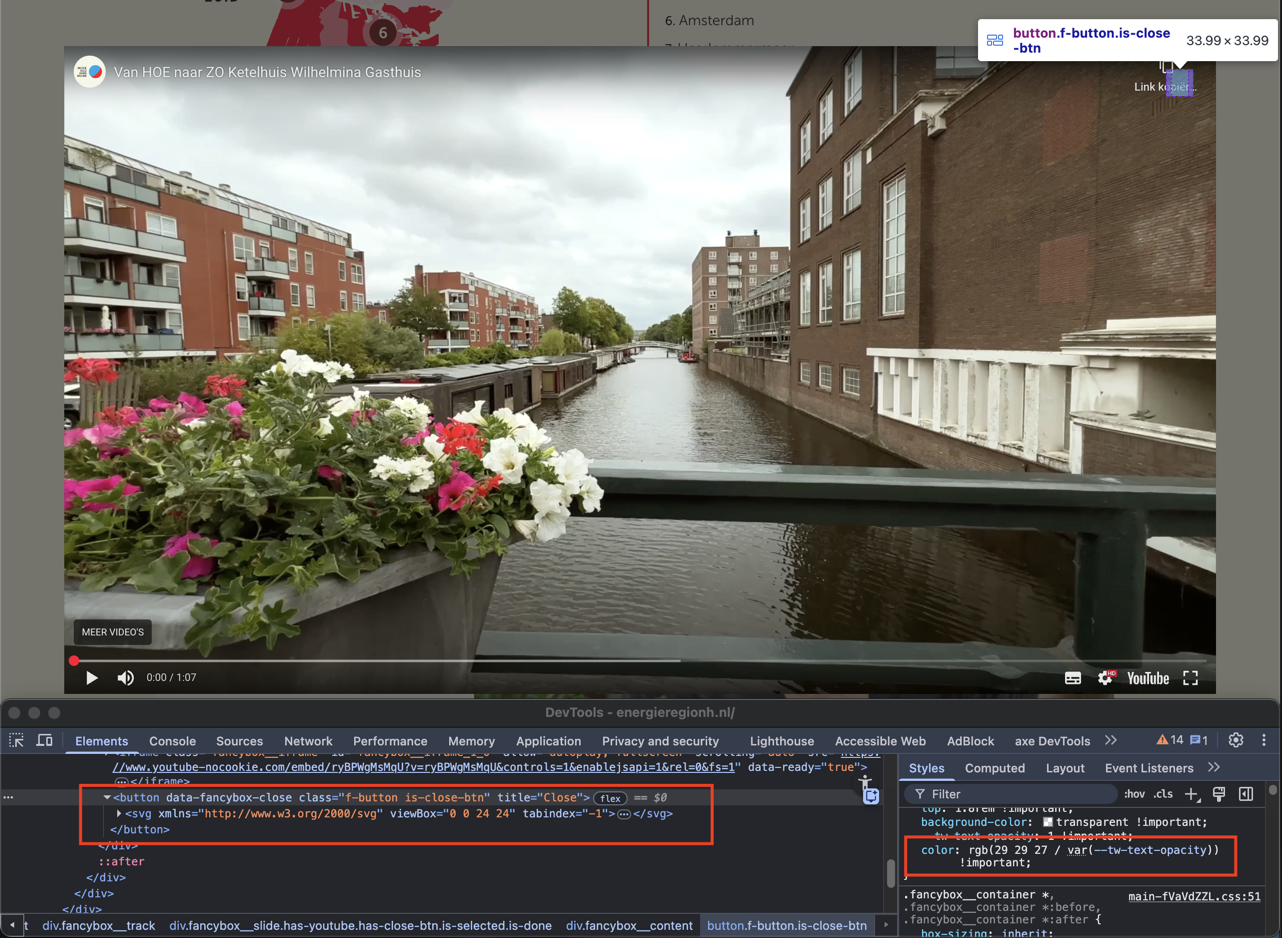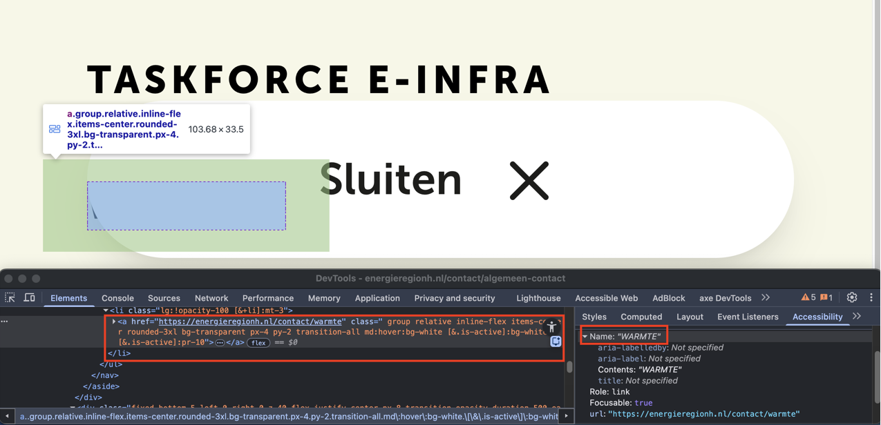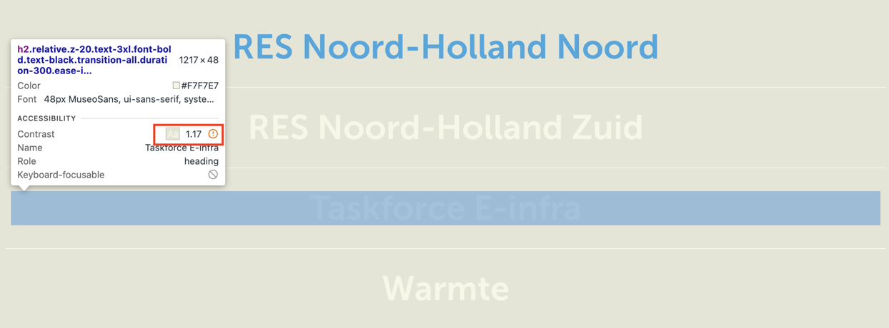 De toegankelijkheidsproblemen die bij deze interactieve elementen en het dialoogvenster zijn vastgesteld, zijn hetzelfde als die al eerder zijn beschreven voor de vergelijkbare elementen op de homepagina https://energieregionh.nl/ onder de kop “Inspirerende verhalen”. Deze problemen hebben betrekking op de volgende succescriteria: 1.1.1, 1.4.11, 2.4.3, 2.4.4, 2.4.6, 3.1.2 en 4.1.2.