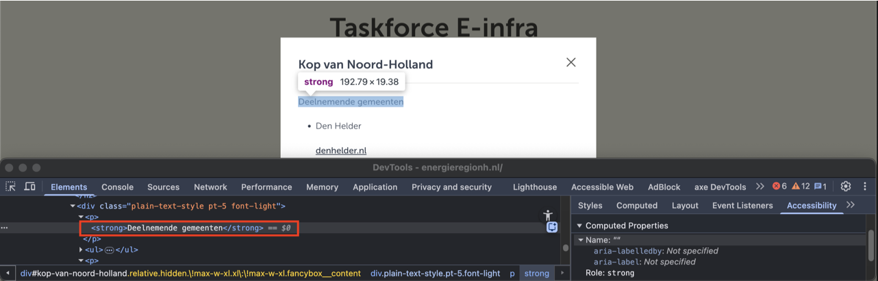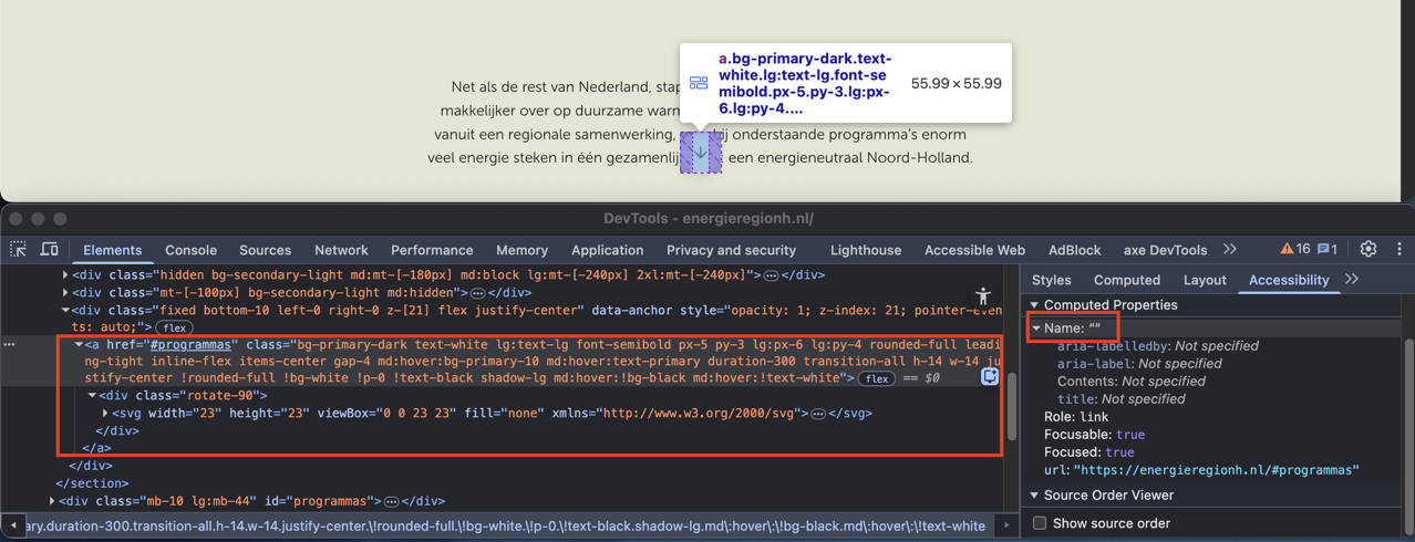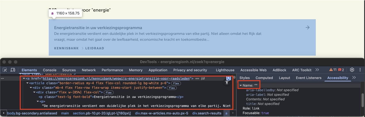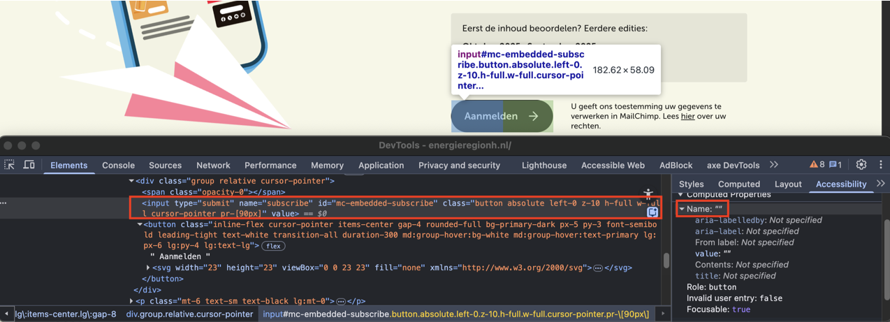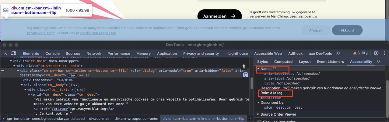Wanneer een bezoeker de website voor het eerst bezoekt, verschijnt er een cookiebanner. In de HTML-code is deze cookiebanner gemarkeerd met role=”dialog”. Dit dialoogvenster heeft echter geen toegankelijke naam.