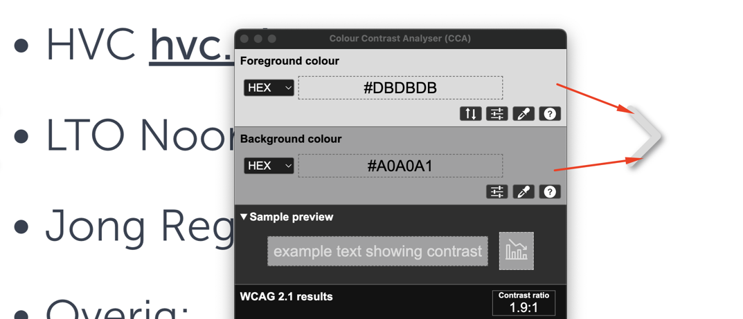 Op pagina 8 staat witte tekst op een lichtgroene achtergrond (#B8D3D5). De contrastratio is 1,6:1.