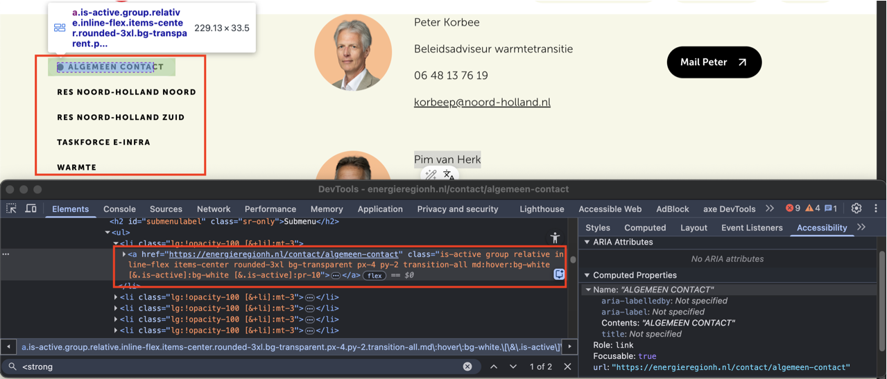 Op deze pagina is een submenu in de zijbalk aanwezig. De toegankelijkheidsproblemen die hierbij zijn vastgesteld, zijn hetzelfde als eerder beschreven voor het vergelijkbare submenu op de pagina “Algemeen contact” https://energieregionh.nl/contact/algemeen-contact. Deze problemen hebben betrekking op de volgende succescriteria: 1.3.1, 1.4.10, 2.4.3 en 2.4.11.