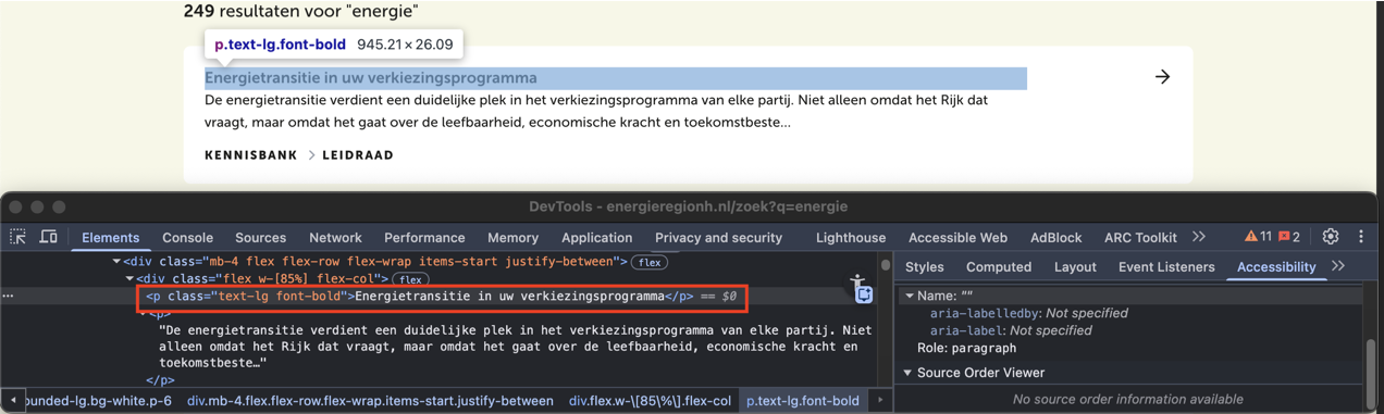 Op deze pagina staan onder “Gerelateerde content” artikelen waarbij de volgorde van HTML-elementen niet logisch is. De teksten staan boven de kop waar ze bij horen. De huidige volgorde is de datum, bijvoorbeeld “25 mei 2023”, daarna de kop en vervolgens de tekst.