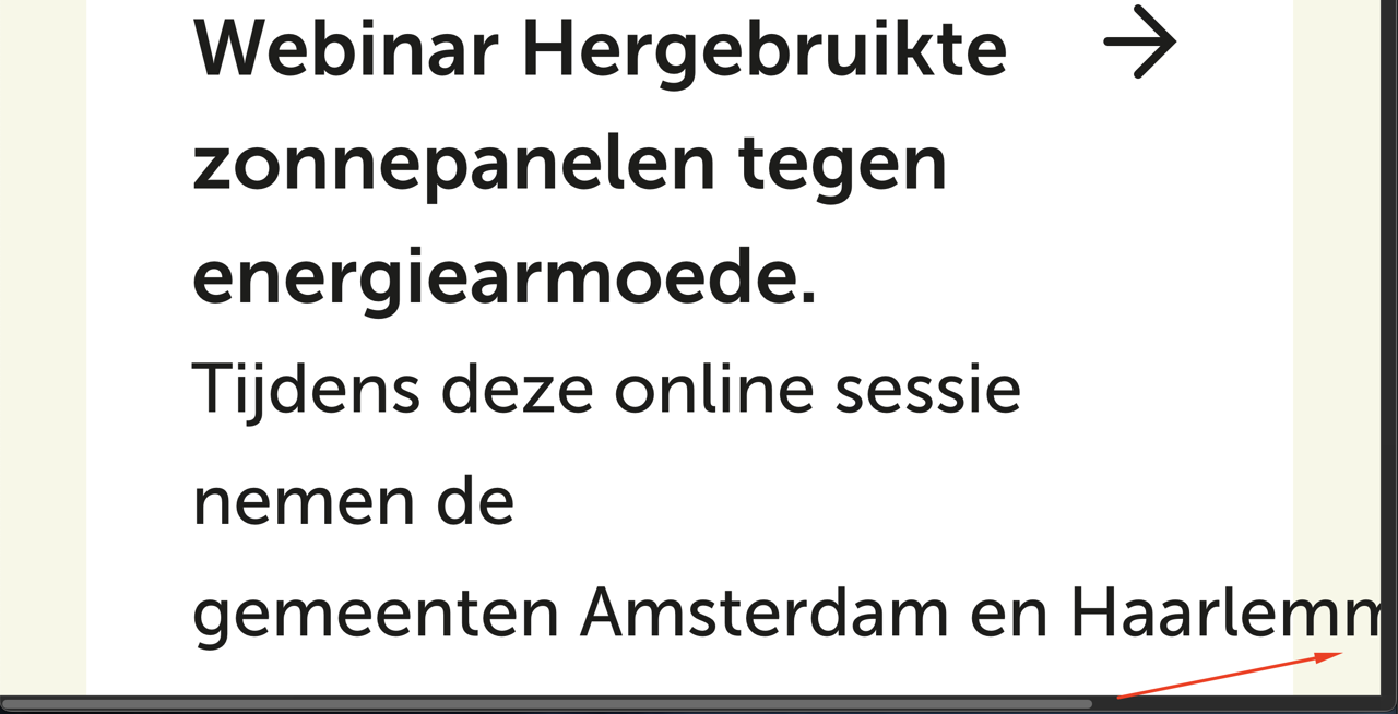 Horizontaal scrollen is niet toegestaan, ook niet als de viewport is ingesteld of ingezoomd op 320 CSS-pixels breed (voor verticale inhoud) of 256 CSS-pixels hoog (voor horizontale inhoud). Zorg ervoor dat de tekst binnen het scherm past. Alleen als scrollen in beide richtingen echt nodig is voor de betekenis of het gebruik van de inhoud mag het wel. Uitzonderingen zijn tabellen, betekenisvolle afbeeldingen en kaarten. Deze moeten leesbaar blijven, dus binnen deze elementen mag je wel scrollen.