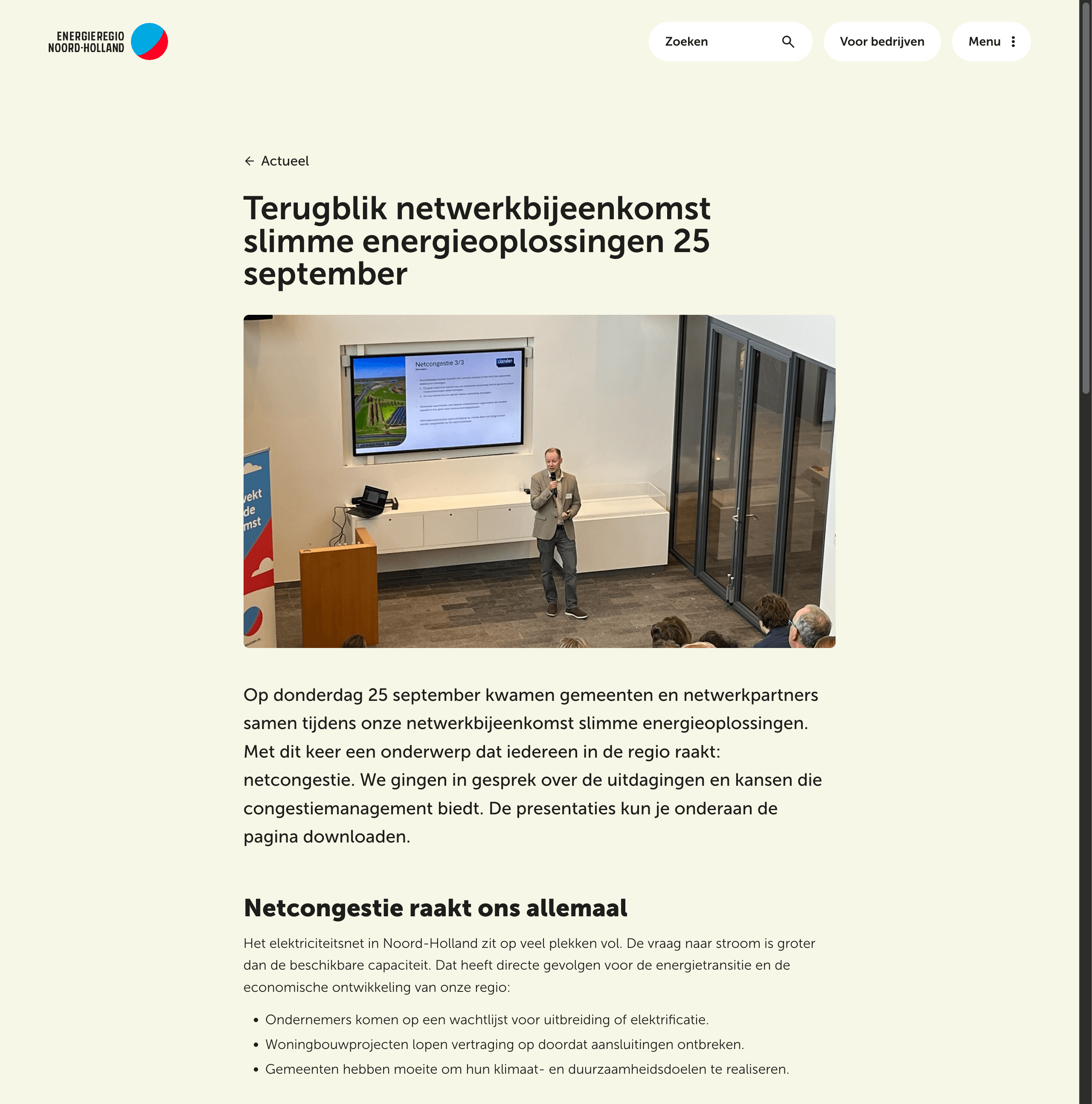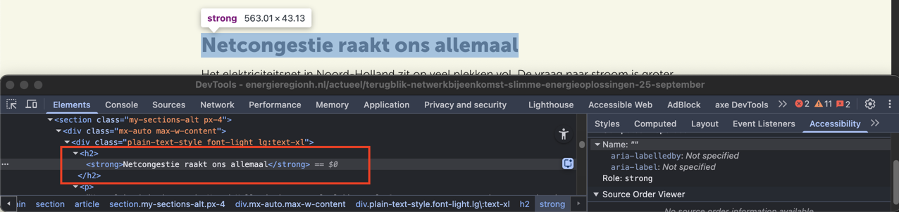 Op deze pagina staan koppen zoals “Netcongestie raakt ons allemaal”, “Congestiemanagement: slimmer omgaan met ons net”, “Hoe werkt dat in de praktijk?” en andere. In deze koppen worden zowel het heading-element als het strong-element gebruikt.