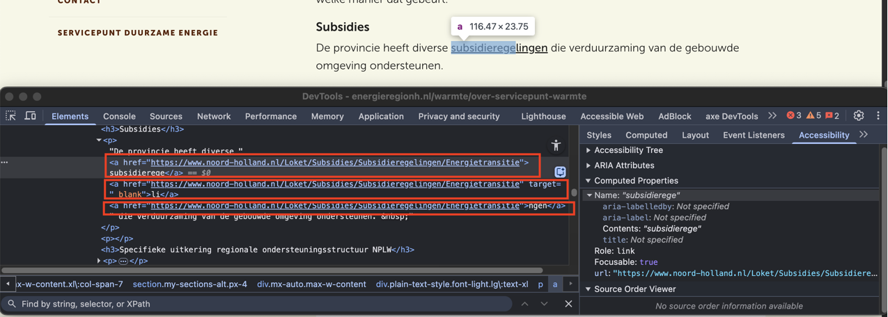 Ditzelfde probleem komt voor bij de link “subsidieregelingen” onder de kop “Subsidies”, waarbij de tekst is opgesplitst in drie afzonderlijke links met dezelfde bestemming.