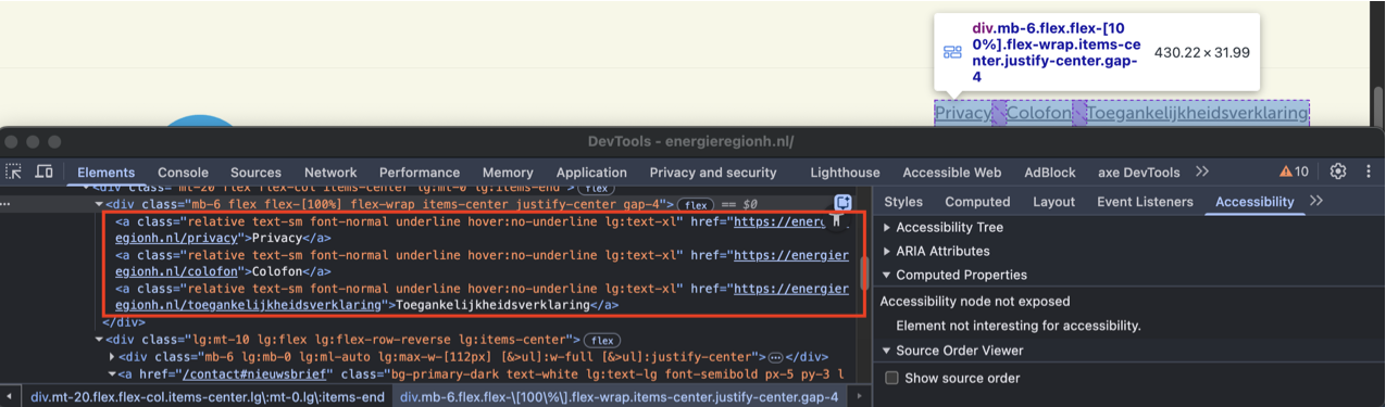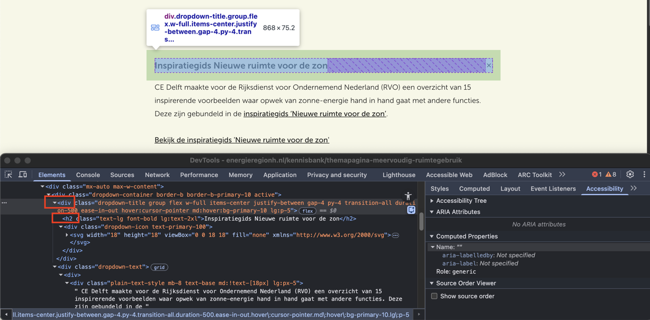 Het grootste deel van het onderzoek doen we met de hand. Voor een deel van de toegankelijkheidseisen gebruiken we automatische tools als ondersteuning, zoals axe-core en Chrome Developer Tools.