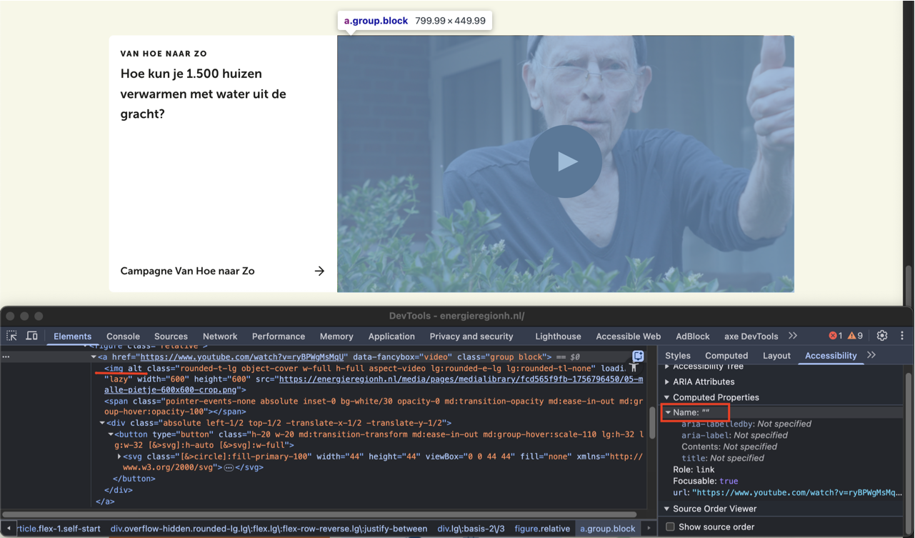 Het logo bovenaan de website toont de volledige tekst "Energie regio Noord-Holland", maar het tekstalternatief is “Go to homepage”, afkomstig van het aria-label-attribuut. In het tekstalternatief staat dus niet alle tekst die in het logo te zien is. Dit moet wel. Zo weten bezoekers die het plaatje niet kunnen zien, ook precies wat er staat.